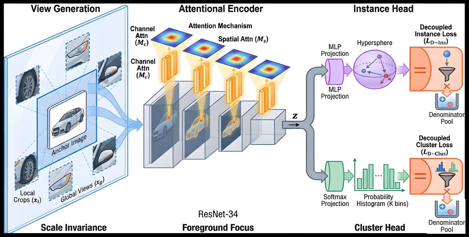 网络的输入端采用了基于多裁剪的数据增强策略。对于每一个原始输入图像,该模块并非简单地生成单一增强视图,而是构建了一组包含不同尺度和视角的视图集合。如图中左侧所示,原始图像经过随机裁剪、翻转、颜色抖动等操作,生成了两个包含全局语义信息的高分辨率视图以及多个关注局部细节的低分辨率视图。所有生成的增强视图共享同一个特征提取器。该模块以深度残差网络为主干架构,并在其基础残差块中无缝集成了卷积块注意力模块。特征提取器包含四个阶段,分别堆叠了3、4、6、3个融合了CBAM的残差块。特征提取器输出的高维特征向量被送入两个并行的非线性映射模块,实例级对比头和聚类级对比头。实例级对比头由多层感知机构成[11],包含全连接层和ReLU激活函数。其作用是将特征映射到一个低维的实例特征空间,用于计算样本个体之间的相似度,旨在拉近同一图像不同视图的特征距离,推远不同图像的特征距离,从而学习到细粒度的实例判别性特征。聚类级对比头同样由MLP构成,但在末端接有一个Softmax归一化层。该分支将特征映射到一个维度等于预设聚类数K的概率空间,输出每个样本属于各个簇的软分配概率。网络的优化目标由解耦对比损失优化模块定义,该模块摒弃了传统的耦合式对比损失,转而在实例级和聚类级分别计算解耦对比损失。解耦损失通过移除分母中的正样本项,消除了正负样本之间的梯度耦合效应,提升了学习效率[4]。