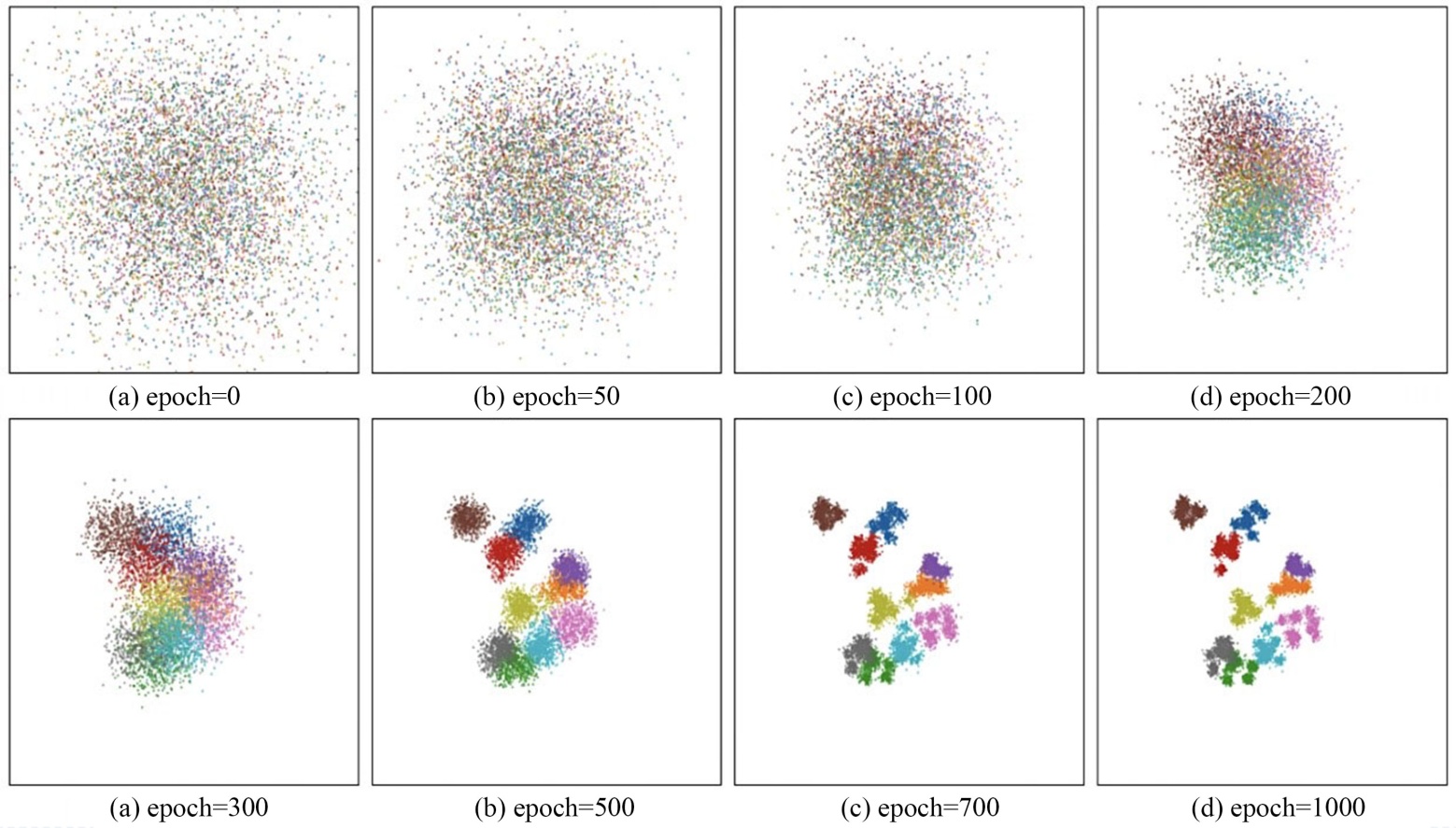 为了更直观地展示DCACN学习到的特征表示的判别能力,本文利用t-SNE算法将ImageNet-10数据集的高维特征映射到二维平面进行可视化。图4展示了随着训练过程的推进,特征空间分布的演变过程。在训练初始阶段,所有类别的样本点混杂在一起,特征分布呈现出无序的混沌状态,表明此时网络尚未提取到有意义的语义特征。随着训练的进行,可以看到不同颜色的样本点开始逐渐聚拢,原本混杂的分布开始出现分裂,形成了初步的簇结构轮廓。在训练后期,簇与簇之间的边界变得日益清晰,类内样本高度紧凑,类间距离显著增大。在Epoch1000时,10个类别的样本点已经形成了10个界限分明、独立的簇团。