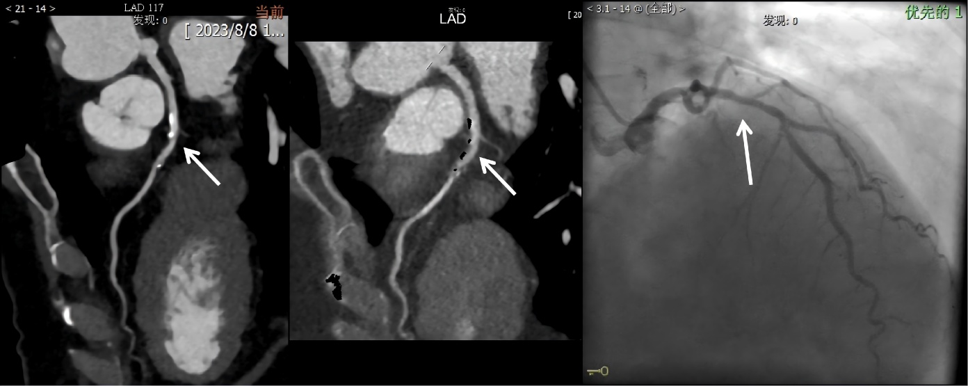 图1. 标准后处理CCTA、双能量减影CCTA及冠状动脉造影图像