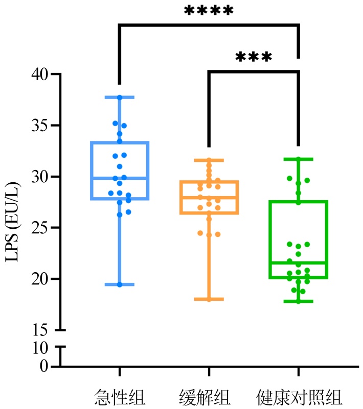 注:图中展示精神分裂症急性组、缓解组及健康对照组的血浆LPS水平分布;箱体代表四分位数间距(P25~P75),箱体中线代表中位数(M),散点为各研究对象的LPS实测值;组间统计学差异通过星号标注:***表示P < 0.001,****表示P < 0.0001,未标*表示P > 0.05。