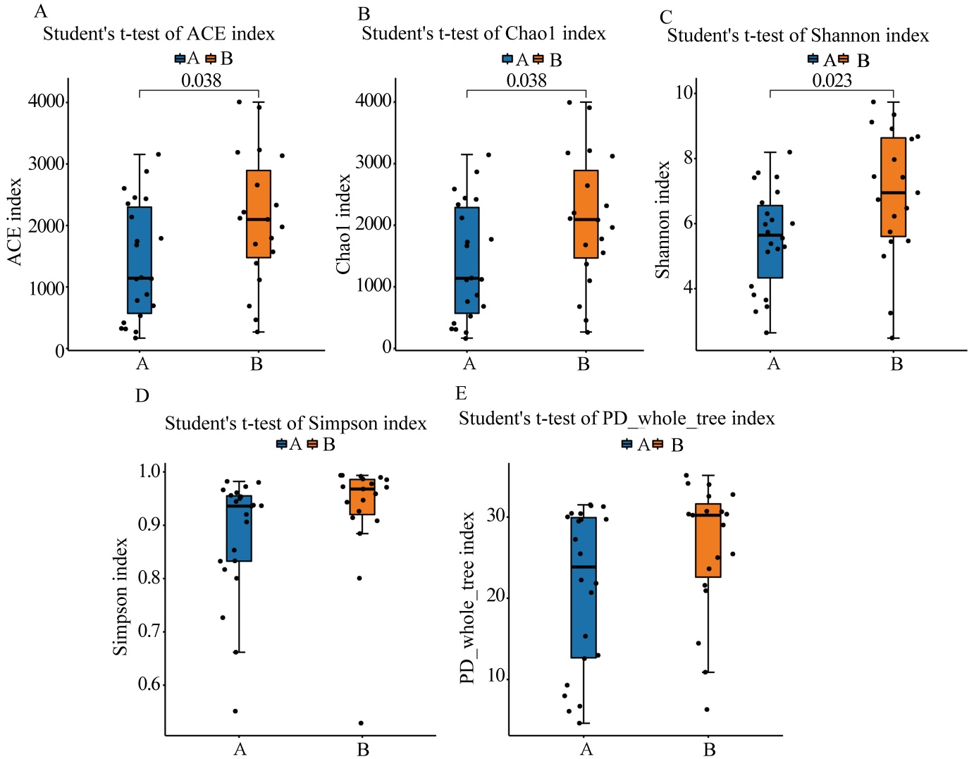 注:横坐标为分组名称,A组为精神分裂症缓解组,B组为精神分裂症急性组;纵坐标为相应alpha多样性指数的值。箱线图中,各符号含义如下:箱的上下端线:上下四分位数(Interquartile range, IQR);中位线:中位数;上下边缘:最大最小内围值(1.5倍的IQR);在上下边缘的外部的点:表示异常值。柱子间的连线上的数字为T检验的P值(若P值 > 0.05则默认不显示P值)。