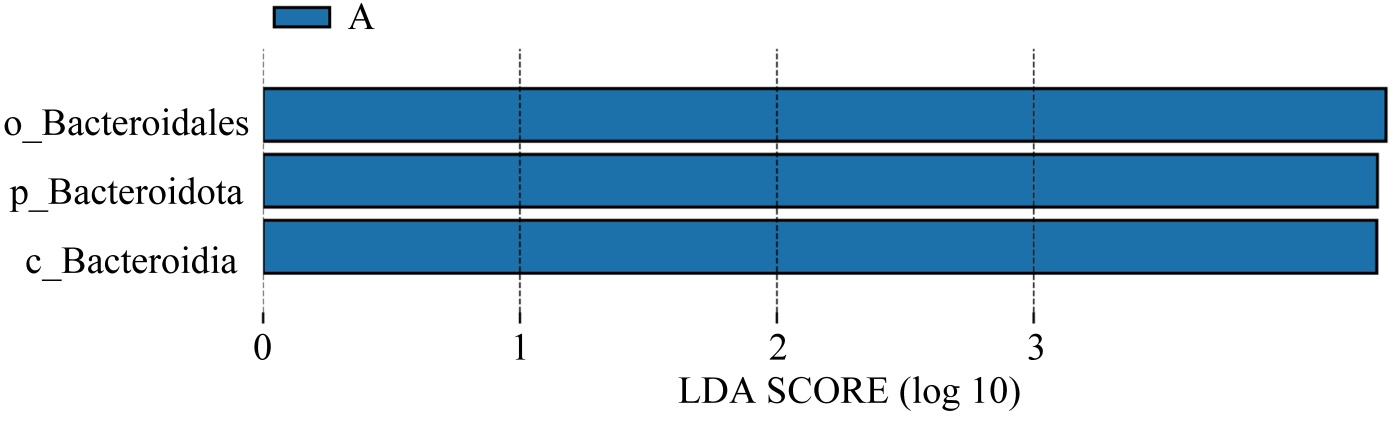 对精神分裂症急性期与缓解期样品开展线性判别分析(line discriminant analysis, (LDA) effect size, LEfSe),以统计检验P < 0.05且线性判别分析(linear discriminant analysis, LDA)效应量 ≥ 2.0为筛选标准,发现在分类学层面上,拟杆菌门(p_Bacteroidota, P = 0.03, LDA = 4.34)、拟杆菌纲(c_Bacteroidia, P = 0.03, LDA = 4.34)、拟杆菌目(o_Bacteroidales, P = 0.015, LDA = 4.37)这3个分类水平的类群在精神分裂症急性组(A组)中均呈现出显著富集的特征,结果详见图5。