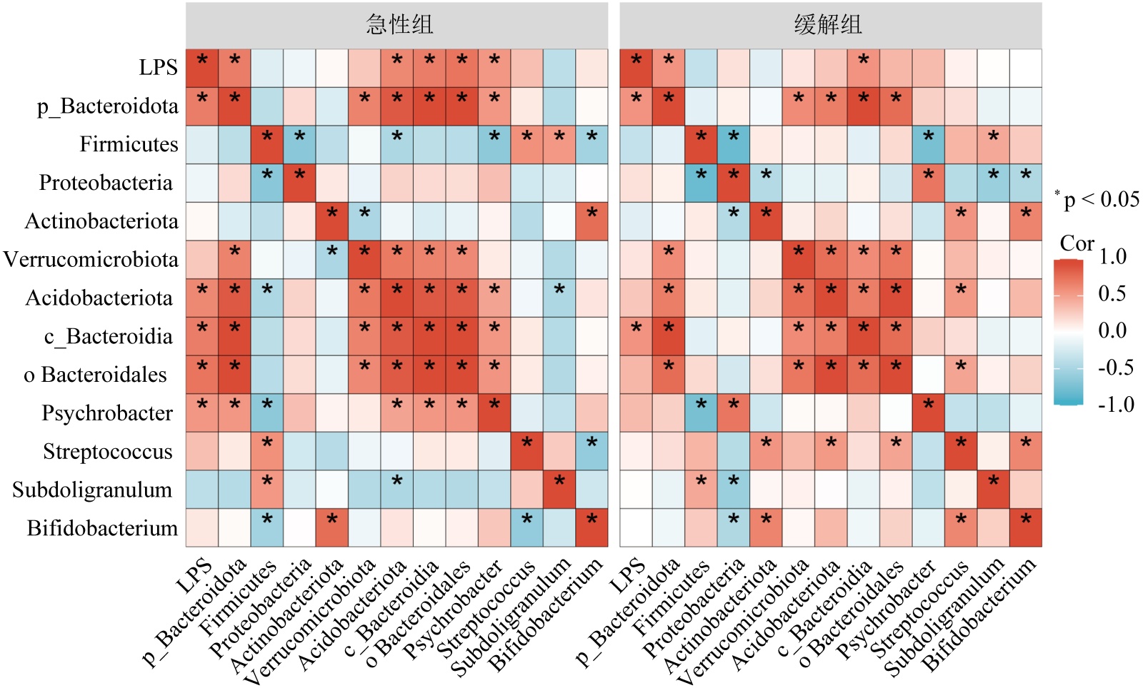 相关性分析:符合正态分布的变量采用Pearson相关分析,非正态分布或等级资料采用Spearman相关分析。针对急性期、缓解期患者的血浆LPS水平与核心菌群相对丰度,采用R软件(v4.2.1)及ggplot2包(v3.4.4)进行Spearman相关性分析,计算相关系数(rs),双侧检验P值经Bonferroni校正(校正后P < 0.05为显著),并绘制相关性热图。