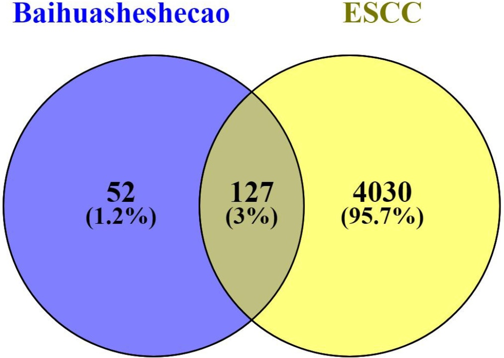 白花蛇舌草(Hedyotis diffusa),茜草科(Rubiaceae)耳草属(Hedyotis)植物,广泛分布于东亚和东南亚地区,如中国、日本和印度尼西亚等[7]。白花蛇舌草作为传统药用植物,在中医临床实践中具有极高的药用价值,除具清热解毒、利尿消肿的经典功效外,其兼具抗肿瘤、抗炎、抗氧化及免疫调节等多重药理活性,是我国传统中药中重要的药用品种之一[8] [9]。现代药理学研究显示,白花蛇舌草的主要活性成分总黄酮对多种人类肿瘤表现出显著的抗肿瘤活性[10]。近年来,白花蛇舌草作为多种复方药材的核心组分之一,其在食管鳞状细胞癌中的作用效应及潜在药理机制仍缺乏系统性研究[11],阐明其抗肿瘤药理机制已成为当前该领域的关键科学问题[12]。