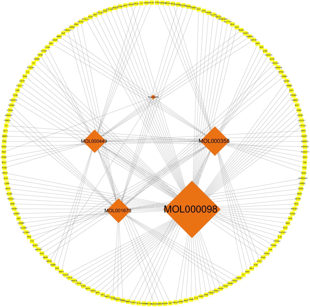 利用中药系统药理学数据库与分析平台(TCMSP, https://tcmsp-e.com/load_intro.php?id=29)数据库检索,以口服生物利用度(Oral Bioavailability, OB) ≥ 30%、类药性(Drug-Likeness, DL) ≥ 0.18为条件,筛选出白花蛇舌草的主要活性成分及其对应靶点,并将数据导入通用蛋白质资源数据库(UniProt, https://www.uniprot.org)得到对应的蛋白质名称。
