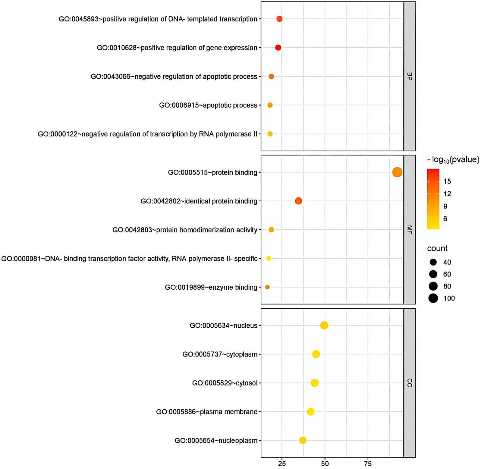 GO分析展示出不同基因功能类别在特定研究中的富集情况,主要从生物过程(BP)、分子功能(MF)、细胞组分(CC)这三个维度呈现。生物过程包括DNA模板转录的正调控、基因表达的正调控、细胞凋亡过程的负调控、RNA聚合酶II转录的负调控等;分子功能中蛋白质与其他分子结合是最显著的类别,这一分子功能在差异基因中广泛存在,可能是核心分子功能之一,此外,相同蛋白质结合,即同源二聚化、蛋白质同源二聚化活性也有一定的富集,蛋白质相互作用(如二聚化、多聚化)可能是关键分子事件;细胞组分涉及细胞核、细胞质、细胞溶胶、细胞膜、溶质等,虽然这些细胞结构相关的类别富集显著性较弱,但仍能看出差异基因在细胞内的分布倾向,见图4。