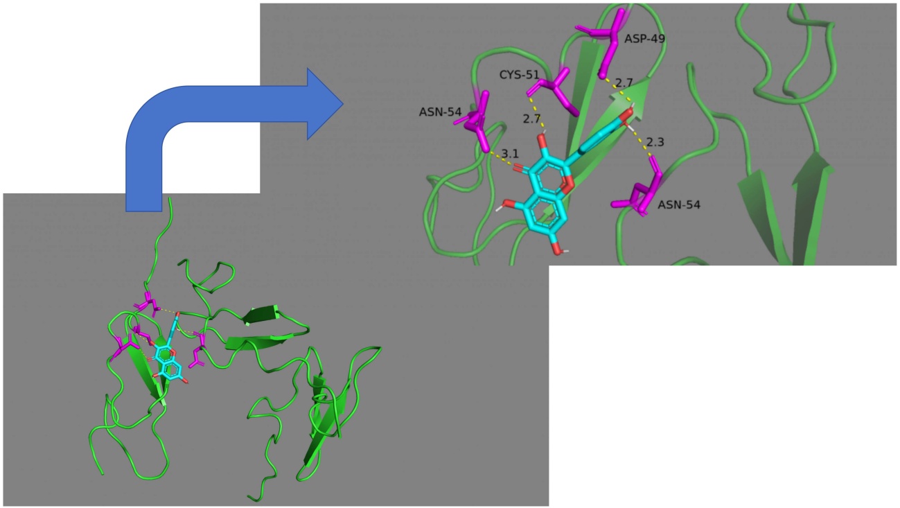 将白花蛇舌草核心成分中的Quercetin与关键靶点蛋白进行分子对接。筛选出Degree值前三的关键靶点NFKB1、TP53、EGF与核心成分进行对接。结果显示:在EGF中2bo2的分子结合能为−7.3,5vyg的分子结合能为−7.0;在NFKB1中8TQD的分子结合能为−6.8;在TP53中3DCY的分子结合能为−7.9,说明其关键靶点蛋白对Quercetin具有一定的结合能力,见图6~9。