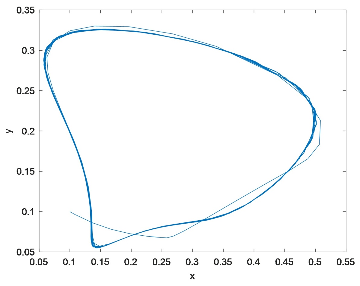 相平面上分支的情形,可以看出系统存在周期解,即产生了Hopf分支。验证结果与理论分析的结论相吻合。