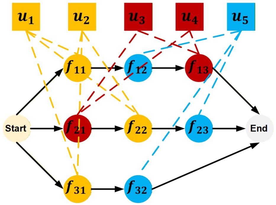 每个业务由一组相互依赖的子业务组成,每个子业务映射到具有不同计算功能的设备。并遵循严格的执行顺序。设