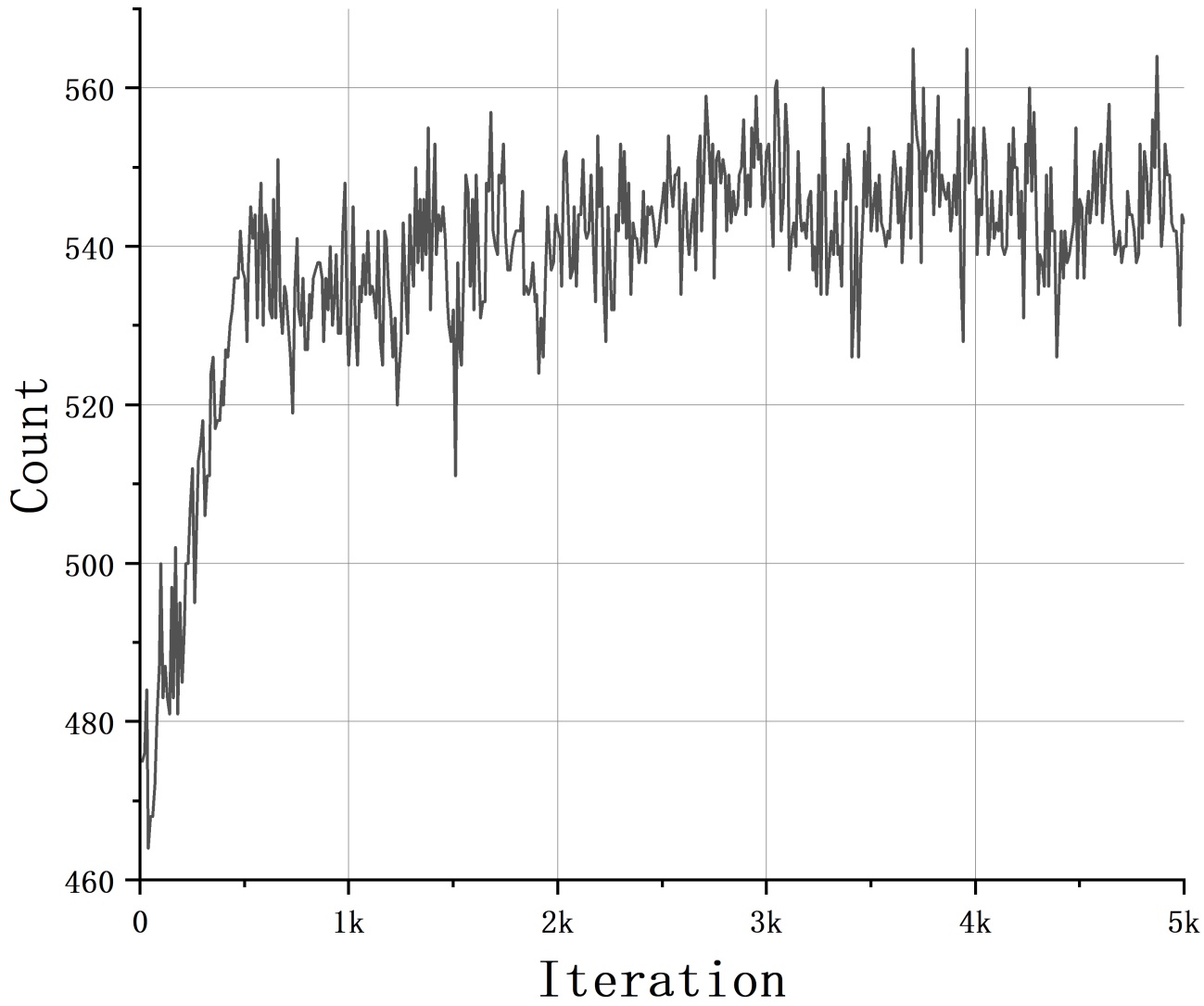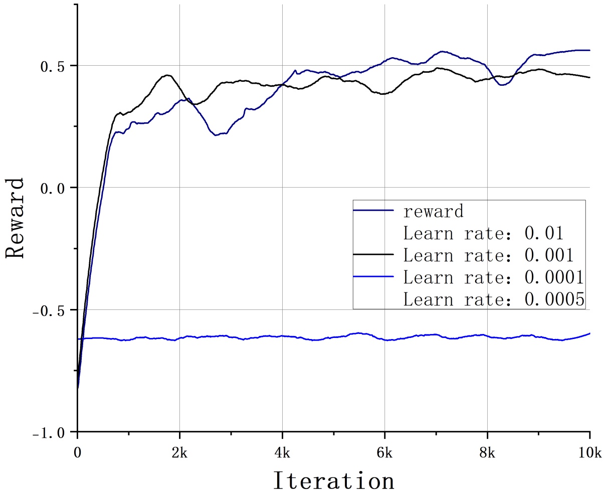 在图2中,我们研究学习率对算法性能的影响。从结果可以看出,学习率为0.0001时表现出较为平稳且良好的收敛趋势。虽然初始阶段的收敛速度略慢于学习率为0.001和0.0005的情况,但在训练后期,0.0001的曲线趋于平稳,且最终取得了相对更好的长期表现,避免了过大的波动和不稳定性。相比之下,0.01的学习率表现出明显的波动,甚至没有显著的提升趋势。因此,选择0.0001作为本实验的学习率,有助于提高模型的稳定性和最终性能。