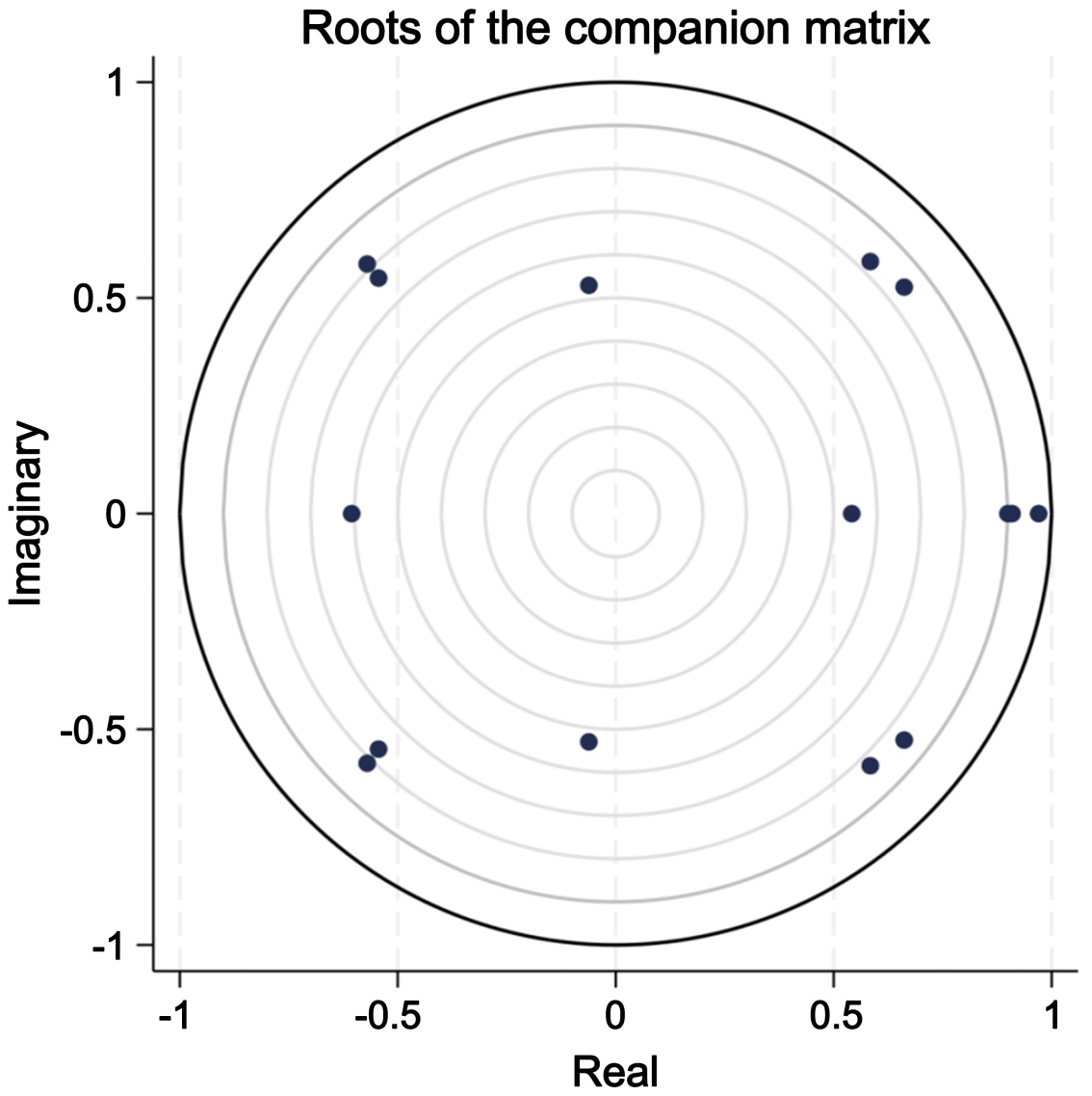 PVAR模型建立后需要对于估计出的模型系统进行稳定性检验。如果模型系统不稳定,PVAR模型得出的结果就不是有效的。在此本文利用AR根进行检验,如果估计的PVAR模型所有特征根的模均小于1,即位于单位根圆内,则其是稳定的。下面给出单位根图形表示的结果如图2所示,可以看出PVAR模型系统是稳定的。