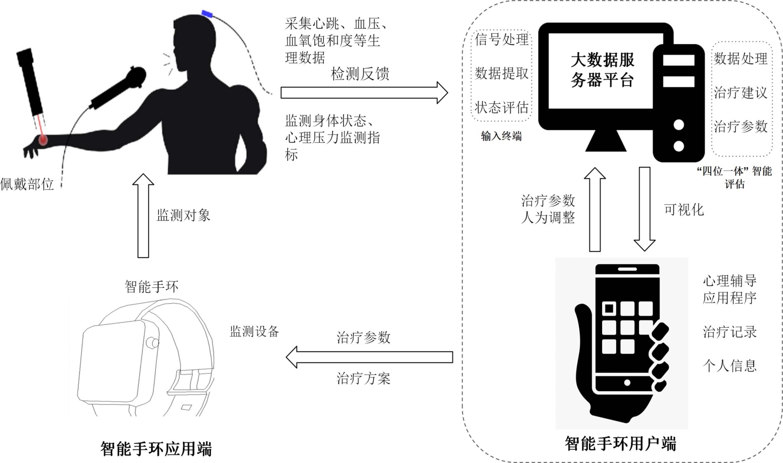 集成多种传感器的智能手环,可作为实施综合康复监测的关键工具,持续捕获心率、血压、血氧饱和度等核心生理参数,实现对受训者身体状态的实时动态追踪,有助于及时识别并预警过度训练风险,从而为训练负荷的科学调控提供参考依据。借助心率变异性等反映自主神经功能的指标,智能手环还能辅助评估官兵的心理压力水平,当其与配套的心理干预平台联动时,可构建全方位辅助支持系统,助力军人在军事康复训练中实现身体与心理的双重康复,如图1所示。