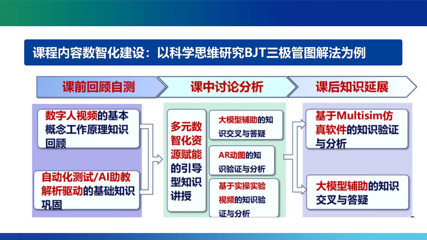 BJT图解法是理解三极管放大电路工作机制的关键,也是模拟电子技术课程的教学重难点。本教学改革案例以AI技术为抓手,构建BJT图解法立体化教学场景:依托数字人视频讲解模块,动态演示不同工况下BJT工作点的移动轨迹及信号放大全过程,将抽象原理转化为可视化的动态过程,直击理解难点;借助Multisim虚拟实验平台,支持学生自主调整电路参数、反复推演图解过程,突破线下实验的时空与硬件限制,强化“参数调整–结果分析–规律总结”的闭环实践[7];通过AI教学助手的交互引导,培养学生运用AI工具分析复杂电路、解决工程实际问题的能力,契合新工科对工程思维与创新能力的培养要求[8]。