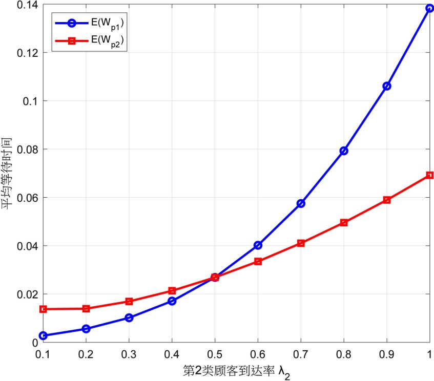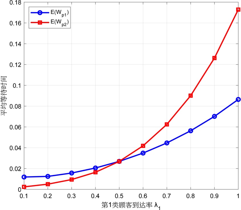 的变化对两类顾客等待时间的影响;图3展示了当固定1类顾客到达率是