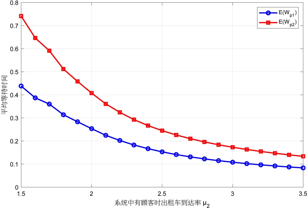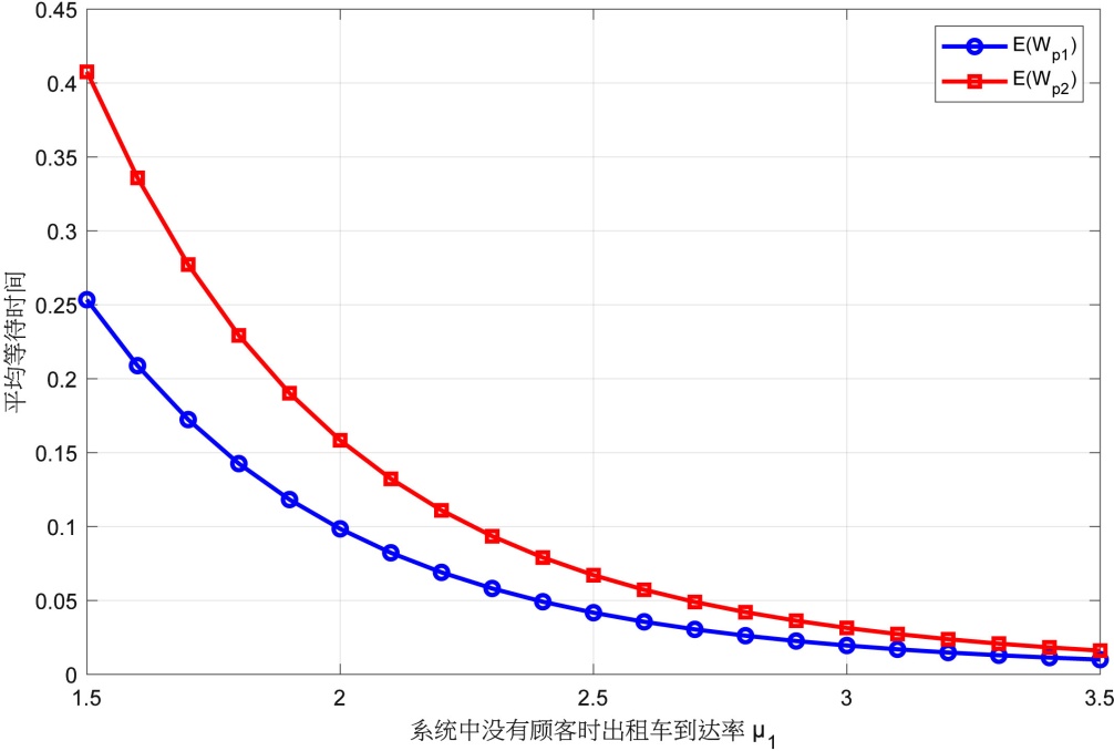 超过3以后,曲线逐渐平缓,说明此时继续增加繁忙期的出租车到达率,对进一步压缩等待时间的贡献逐渐减弱。上述两个图共同揭示了一个关键策略:在资源有限的情况下,同时优化系统在空闲状态和繁忙状态的服务资源分配,是降低顾客等待时间的有效途径。