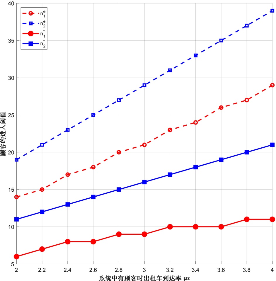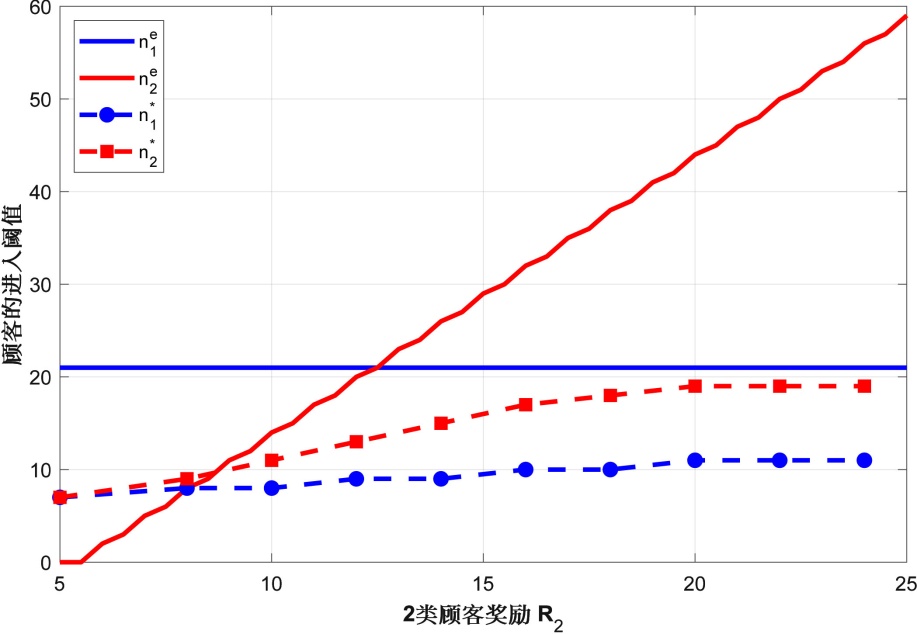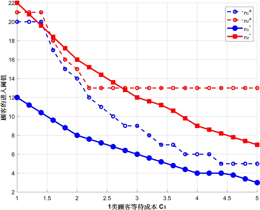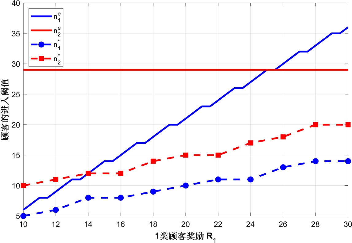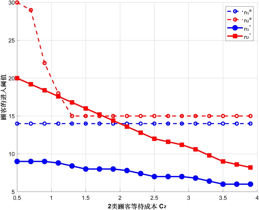 ,即当系统中的某类顾客数小于自身进入阈值时,则这类顾客选择进入;否则止步。两类顾客的阈值顺序将由他们的净收益结构决定,即取决于