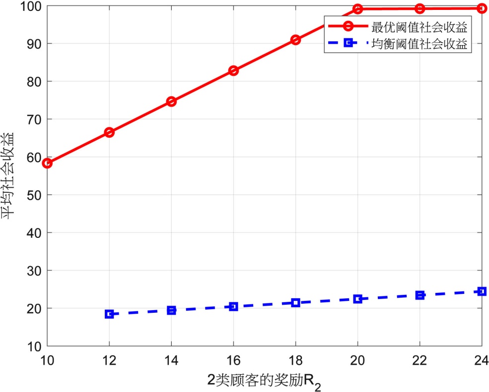对1类顾客的均衡阈值没有影响,对2类顾客的均衡阈值和两类顾客的社会最优阈值均是逐渐增加的,2类顾客的均衡阈值增加较快,社会最优阈值增加的较为缓慢,但始终有