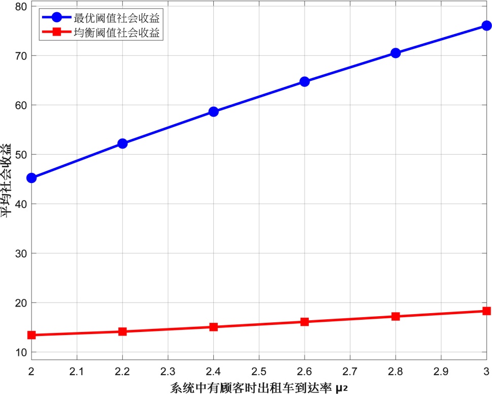 在实际运营中,乘客–出租车匹配系统往往存在“外部性”:顾客在决定是否加入系统时仅考虑自身收益,而忽略了其加入行为对其他顾客和出租车等待时间的影响,从而导致系统整体效率下降(即社会收益未最大化)。为引导顾客行为趋近于社会最优,运营商可通过定价机制(如动态收费或补贴)内部化这种外部性。