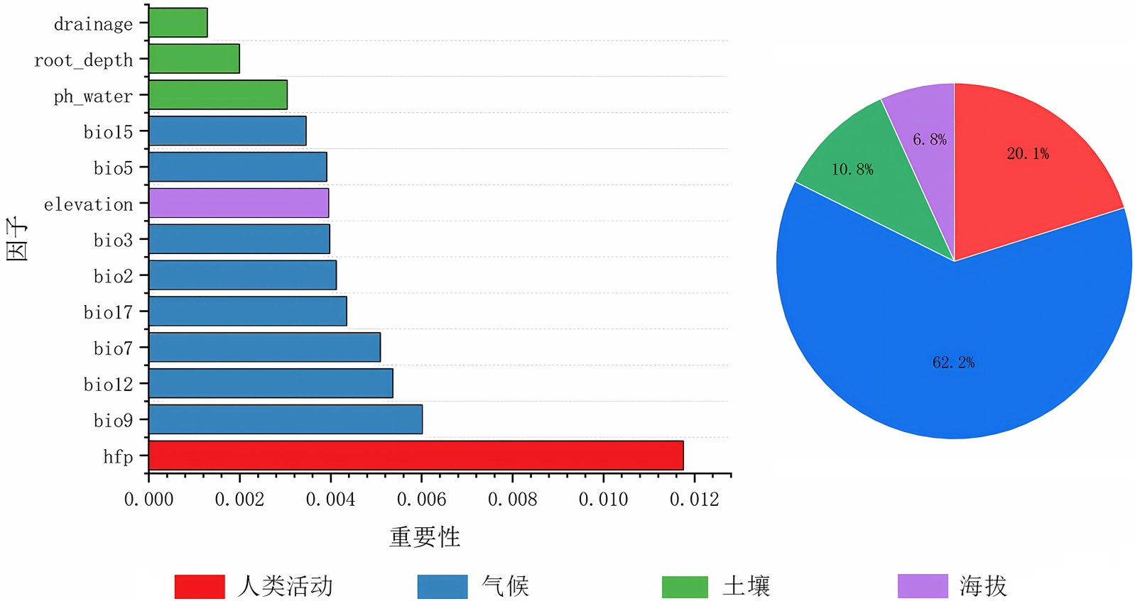 土壤因子虽累计重要性仅为10.8%,但土壤理化性质对黑麦草的建群与存活具有不可忽视的影响。地形因子中海拔的重要性较低,可能与黑麦草较强的适应性有关,但其在高海拔地区的扩张趋势仍值得关注。总体来看,黑麦草的分布是气候、人为干扰与立地条件共同作用的结果,未来预测中需继续重视多因子协同效应。