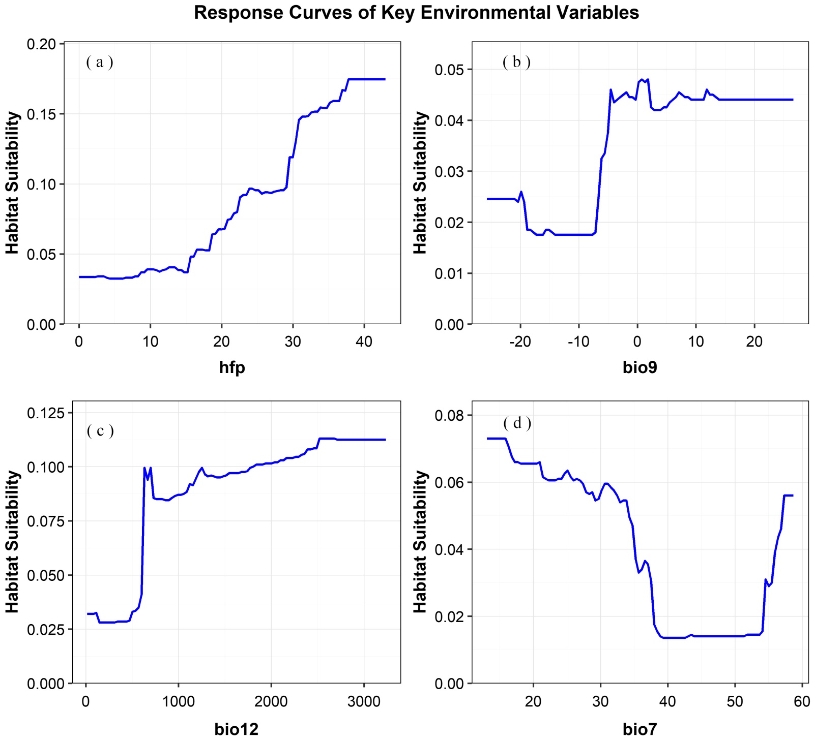 Figure 3. Response curve of key environmental factors: (a)~(d) correspond to the response curves for Human Hootprint, Mean Temperature of Driest Quarter, Annual Precipitation, and Temperature Annual Range, respectively
