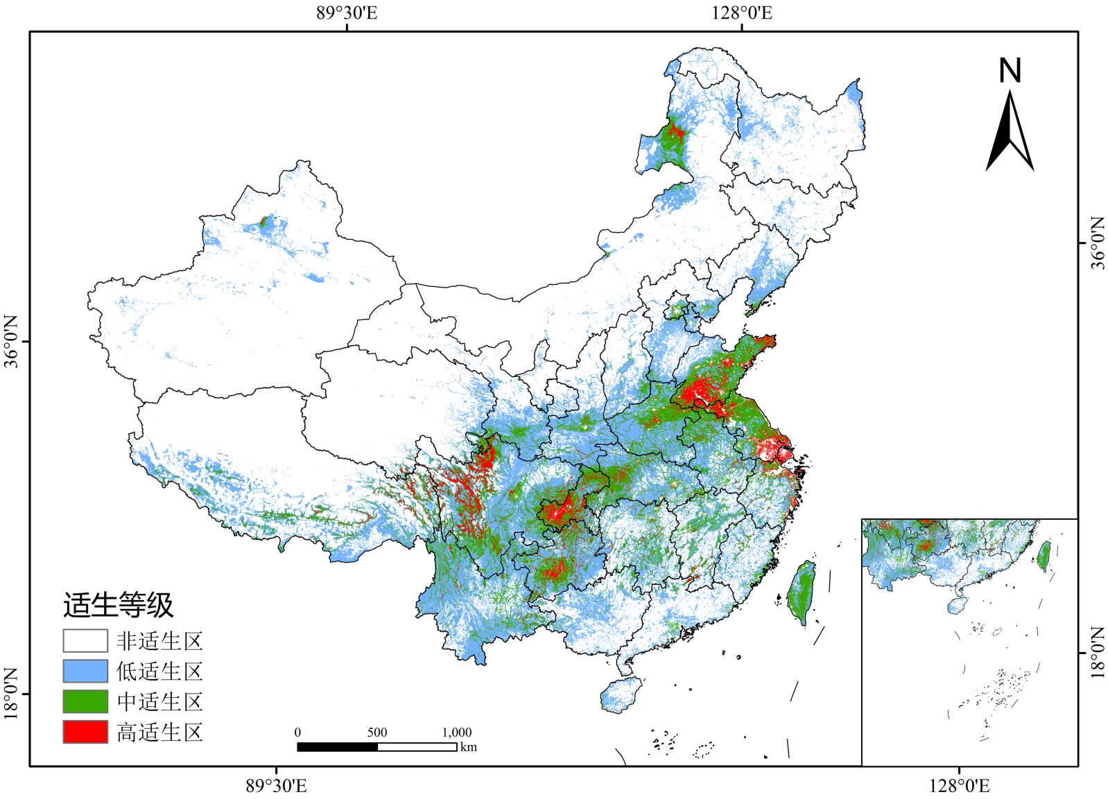 图4. 当前气候变化下中国黑麦草的适生区分布