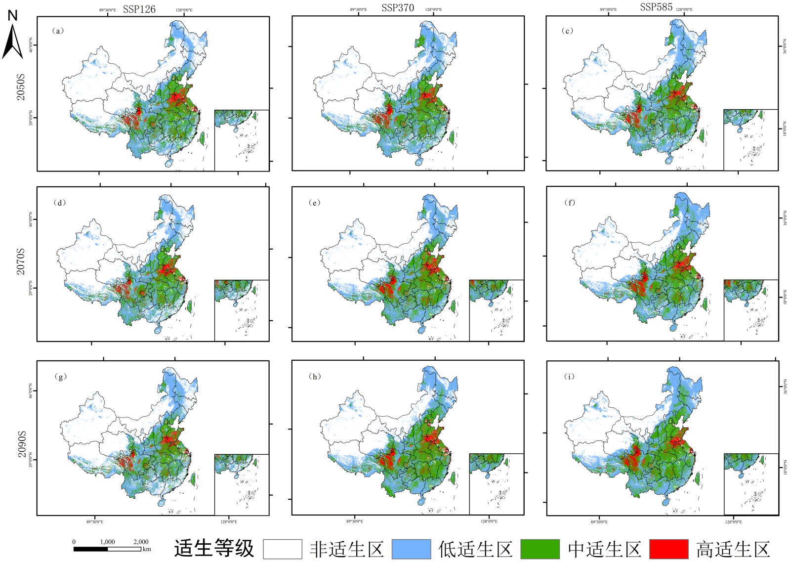 2090年代,SSP126情景下,适生区总面积为454.52 × 104 km2,是当前的1.56倍,高中低适生区面积分别是当前的1.51倍、1.89倍、1.41倍,与2070年代相比,适生区总面积略微缩小,其中,高中适生区面积较2070年代均有所降低,低适生区面积基本保持不变。在SSP370情景下,适生区总面积为559.94 × 104 km2,是当前的1.92倍,高适生区是当前的1.99倍,中适生区2.83倍,低适生区1.50倍,与2070年代相比,高适生区面积几乎不变,中低适生区面积增加。在SSP585情景下,适生区总面积为598.78 × 104 km2,是当前的2.05倍,面积达到最大,高中低适生区面积分别是当前的1.83倍、2.92倍、1.68倍,中适生区面积增加量最大。