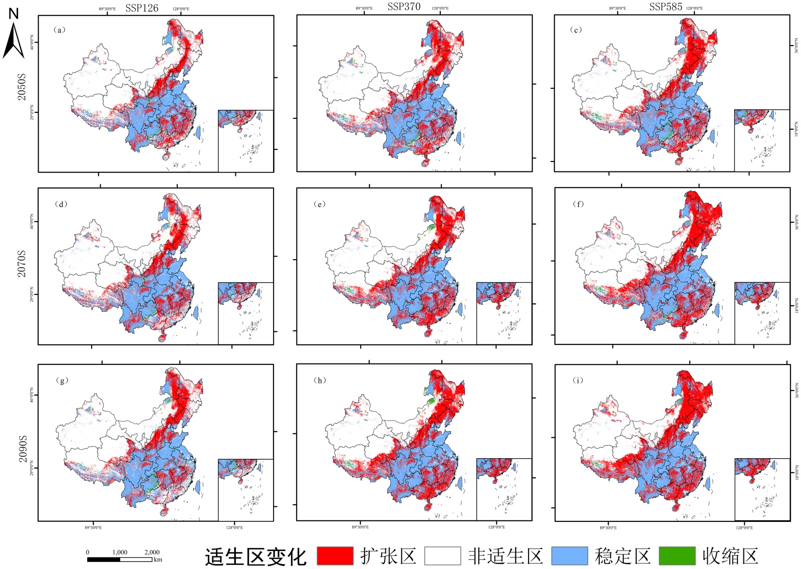 2090年代,扩张区、稳定区面积仍持续增大,越高排放情景下面积越大;SSP126情景下收缩区面积4.20 × 104 km2,达到三个时期最大面积,SSP370收缩区面积3.81 × 104 km2,也高于前两个时期,SSP585气候情景下收缩区面积仅1.66 × 104 km2,面积变化率仅0.57,是所有时期、所有气候情景下面积最小的。扩张区仍向东三省、内蒙古、青藏高原等地推进,东北地区扩张明显,南部省份扩张区位置基本不变。SSP126情景下收缩区位置无明显改变,贵州、内蒙古北部地区的收缩区面积扩大,分布更加集中。SSP370情景下收缩区集中于内蒙古东北部、西藏西部,新疆北部亦有小面积分布。SSP585气候情景下收缩区面积大幅减小,几乎仅剩内蒙古东北部及西藏西部有收缩区。