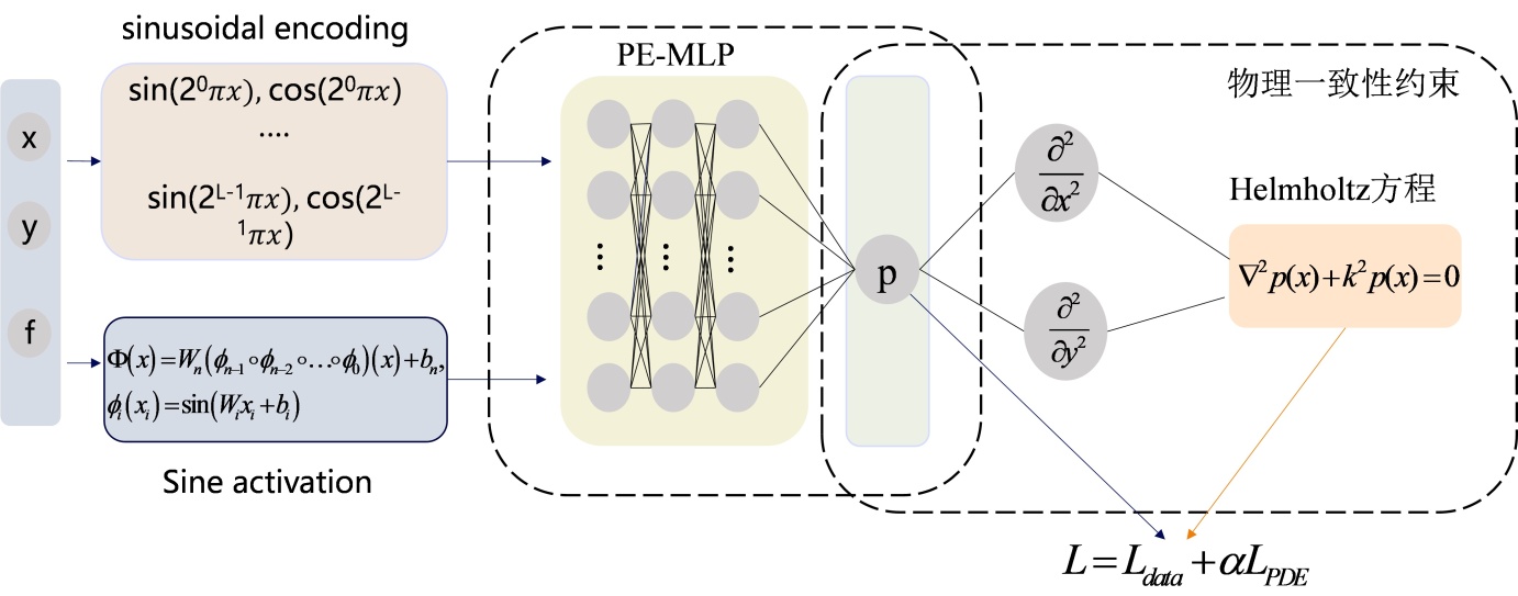 其中k为波数,与声源频率及介质参数相关。基于上述物理背景,本文在不显式求解声学控制方程的前提下,将Helmholtz方程作为物理一致性约束,引入网络训练过程。利用自动微分技术对网络输出进行空间二阶导数计算,构建物理约束损失项,用以刻画网络预测声场与理想声波传播规律之间的偏离程度。该约束以“弱约束”的形式参与模型训练,与基于观测数据的拟合损失共同构成优化目标,从而在保证数据拟合精度的同时,引导模型学习符合声学传播特性的空间分布结构。