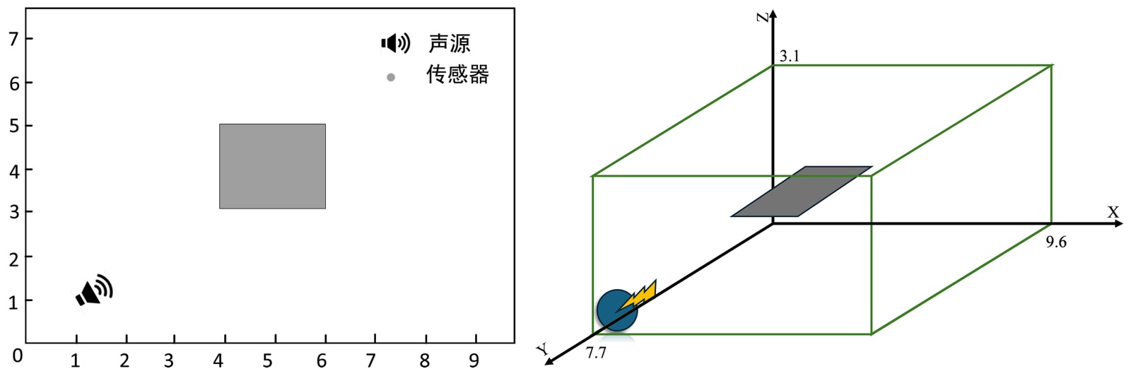 在数据生成过程中,首先构建室内空间的几何模型,并设置声源与接收平面位置,对目标频率下的稳态声场进行数值仿真。图2给出了声源、接收区域及观测平面的空间布置示意,其中声场重建任务限定在选定的二维接收平面内进行。该设置用于明确声场数据的空间来源及采样区域范围,为后续重建任务提供统一的空间参考。