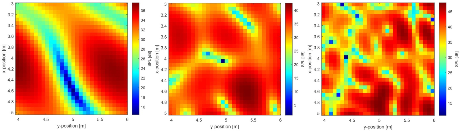 在获得完整声场分布后,对接收平面内的声压幅值进行规则网格化采样,形成连续声场参考结果。随后,从完整网格点集中随机选取部分空间位置作为观测点,构建不同采样密度下的稀疏声场观测数据,用以模拟实际测量条件下有限传感器布置所获得的声场信息。未被选取为观测点的空间位置仅用于模型测试阶段的整体重建效果评估。在具体实验中,选取125 Hz、250 Hz和500 Hz三个典型频率作为研究对象。针对每个频率分别生成对应的室内稳态声场数据,并在相同采样策略下构建训练与测试样本,用以分析所提方法在不同频率条件下的重建性能。