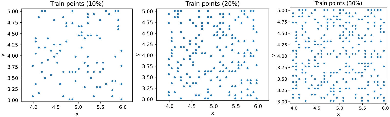 设接收平面内完整声场网格点总数为N,本文在接收平面上采用30 × 30的规则网格进行采样,因此N = 900。为模拟实际工程中“有限麦克风数量”约束,并提升稀疏度定义的可解释性,本文以传感器绝对数量M来表征采样稀疏度,并在括号中给出其相对于全域网格点的比例ρ = M/N。具体而言,本文设置M∈{90, 180, 270},分别对应约10%、20%和30%采样,如图4所示。对应的训练样本数量为Ntrain = M。在数据划分过程中,所有模型在相同采样率条件下采用一致的训练与测试划分方式,以保证不同方法之间对比的公平性。上述设置用于分析模型在不同稀疏采样条件下的重建性能变化,并验证所提方法在有限观测条件下的稳定性与适应性。