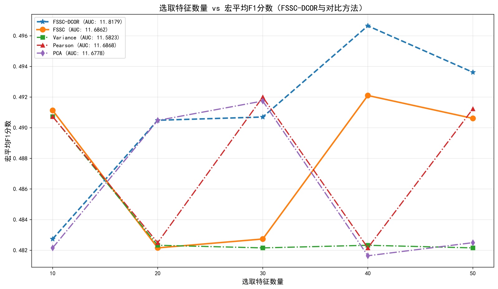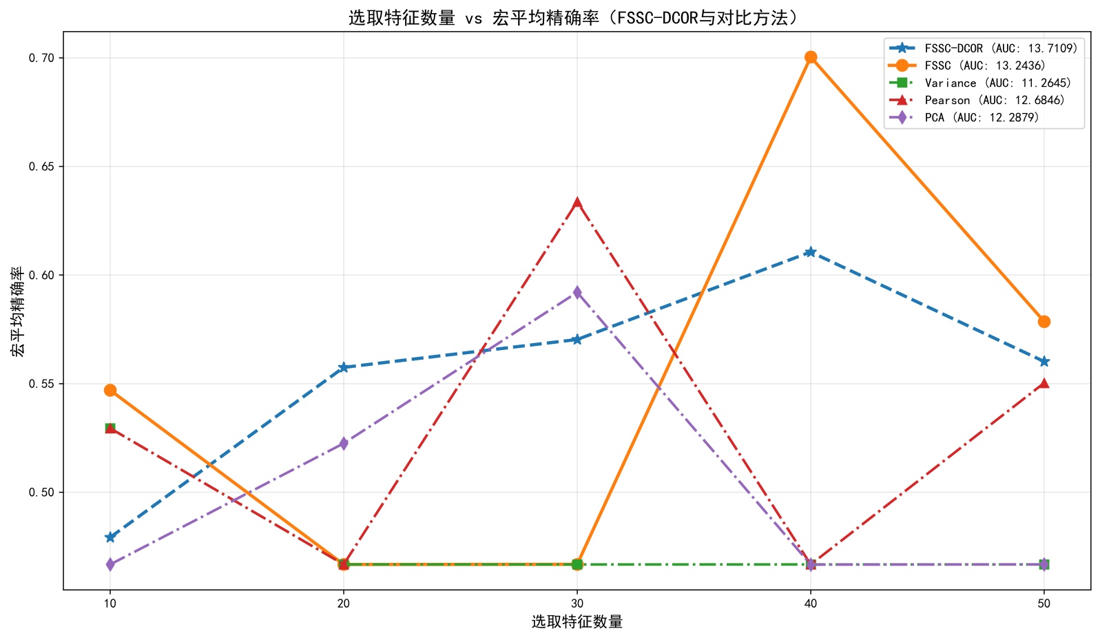 由图3可知,FSSC-DCOR算法在宏F1性能上全面优于FSSC、Variance、Pearson及PCA算法:其近似AUC (11.8179)为所有算法中最高,体现了全特征数量梯度下的综合性能领先;同时FSSC-DCOR的性能曲线更稳定,受特征数量变化的干扰小于Pearson等算法。