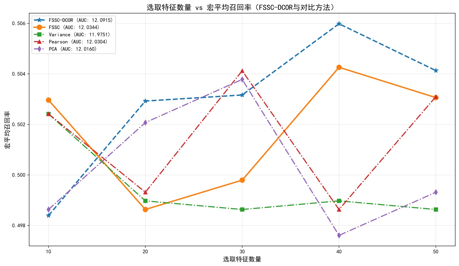由图2可知,FSSC-DCOR在宏平均召回率性能上的近似AUC (12.0915)在所有算法中处于领先水平,显著优于Variance (11.9751)、PCA (12.0160)等对比方法;因此,本文所提的特征选择算法在SECOM半导体数据集上表现更优,所选择的特征子集效果更好。