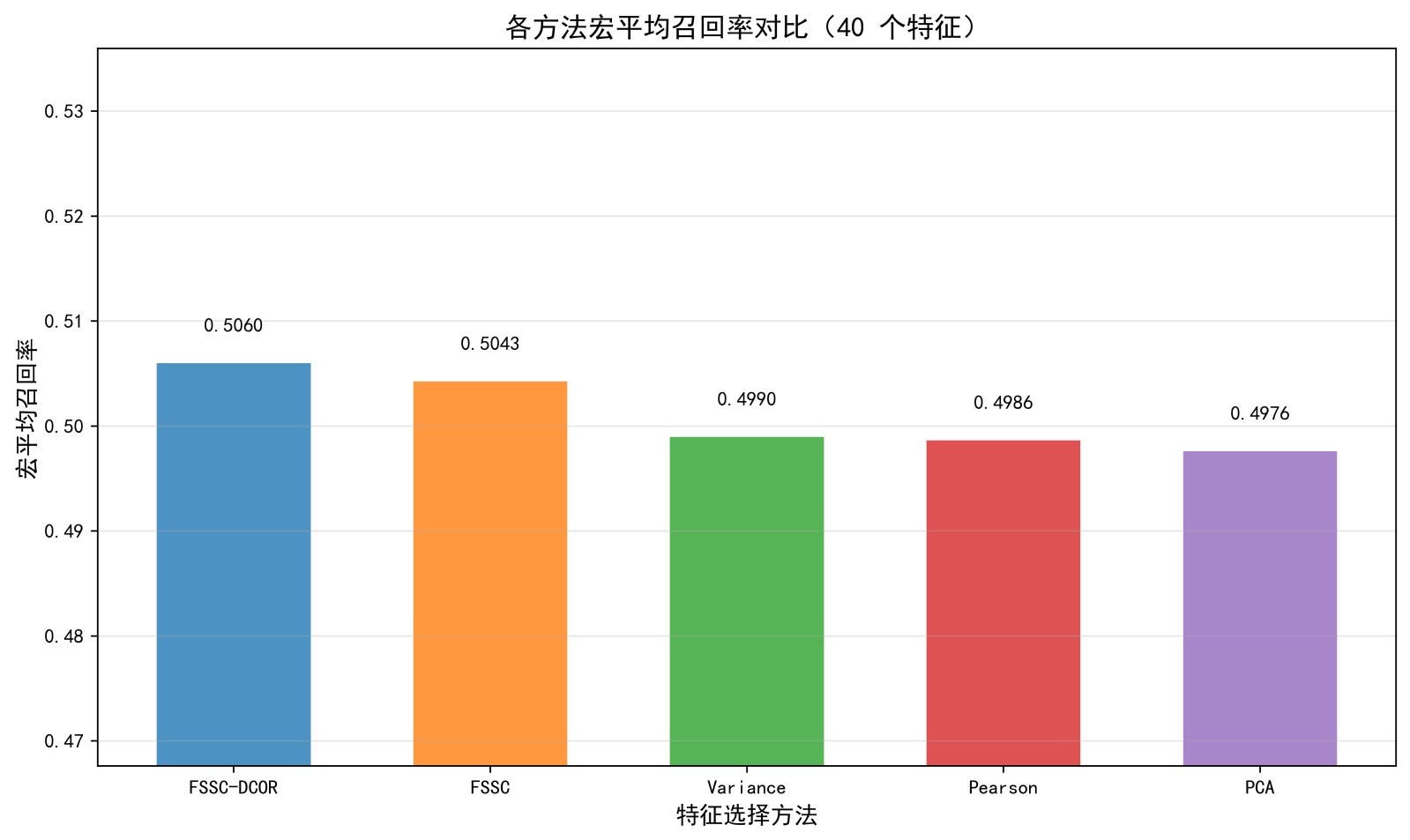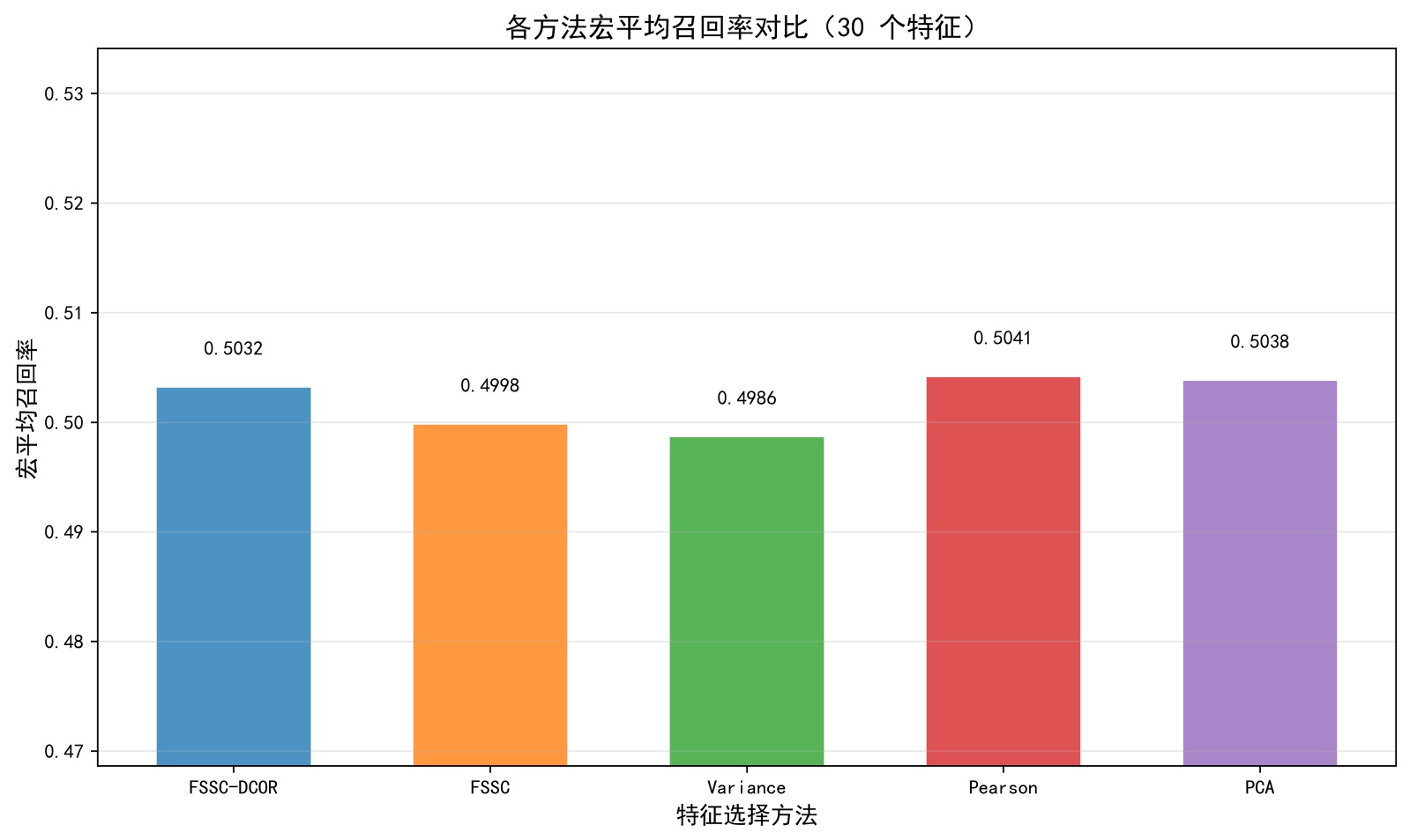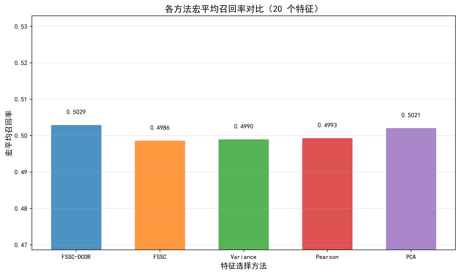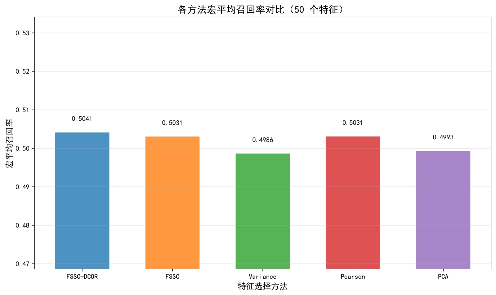 由图5可知,通过4组柱状图分别呈现了特征数量为20、30、40、50时各算法的宏平均召回率在SECOM半导体数据集上的表现,在20个特征场景下,FSSC-DCOR的宏平均召回率(0.5029)为所有算法中最高;30个特征时FSSC-DCOR的召回率(0.5032)与PCA (0.5038)接近,且优于FSSC、Variance等算法;40个特征与50个特征场景中,FSSC-DCOR的召回率(0.5060, 0.5041)均稳定处于最优水平,显著高于Variance (0.4990, 0.4986)、PCA (0.4976, 0.4993)等算法的表现。整体来看,FSSC-DCOR在不同特征数量下的宏平均召回率始终保持稳定且领先的水平,体现出其在特征选择任务中对少数类样本的识别能力更优,是各场景下召回率表现最可靠的算法。