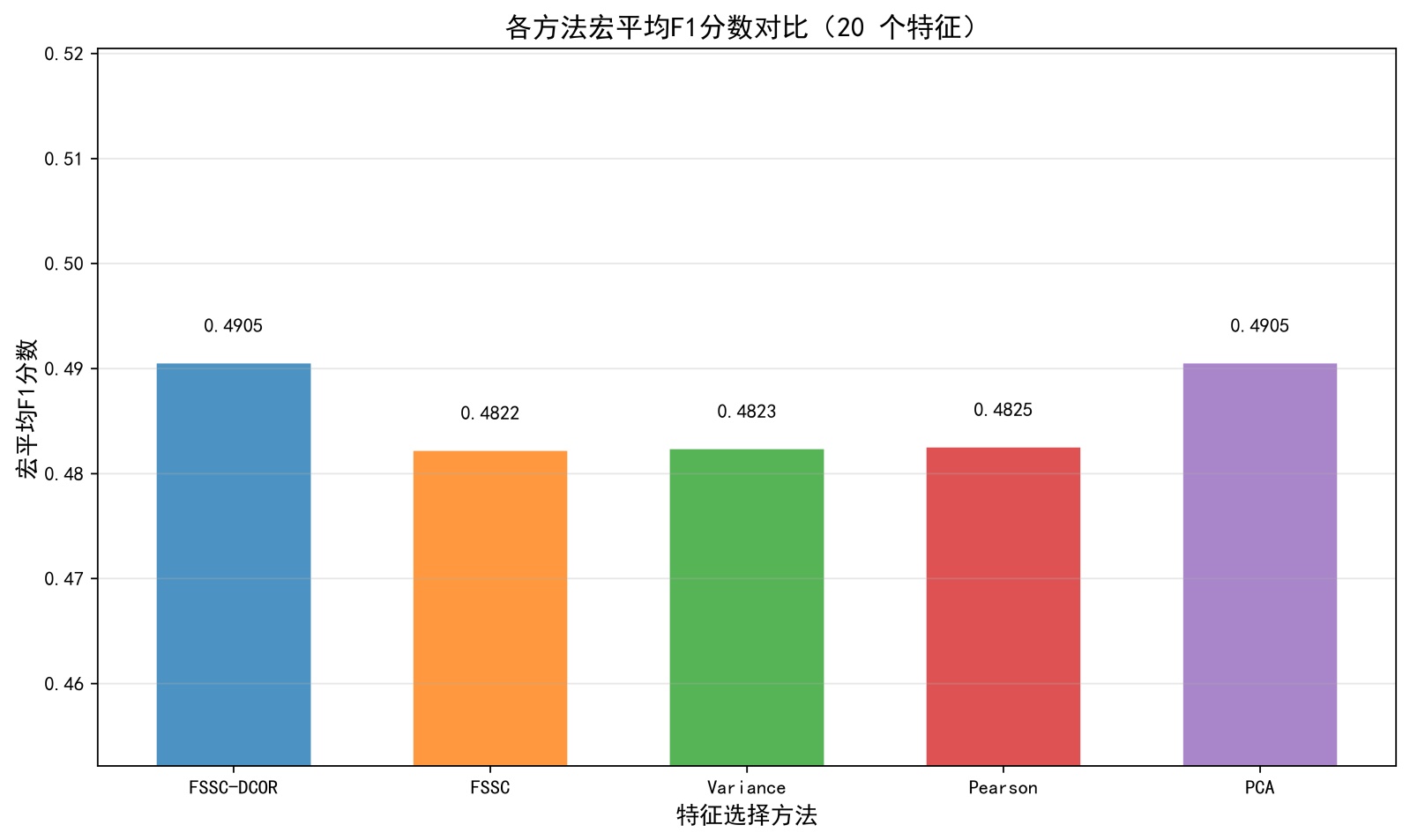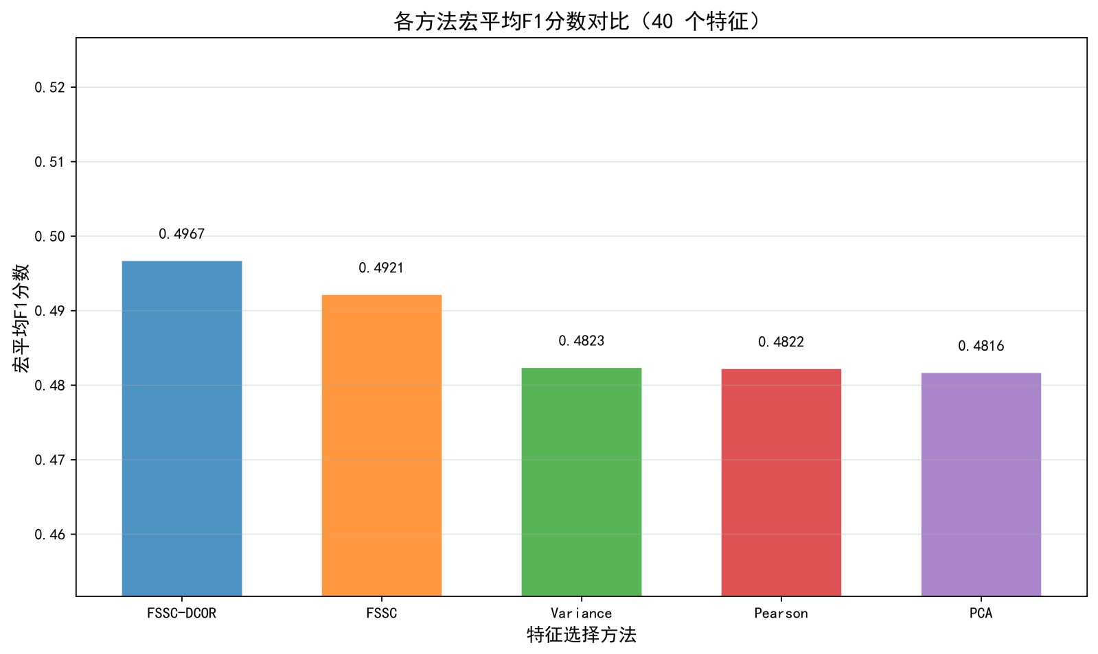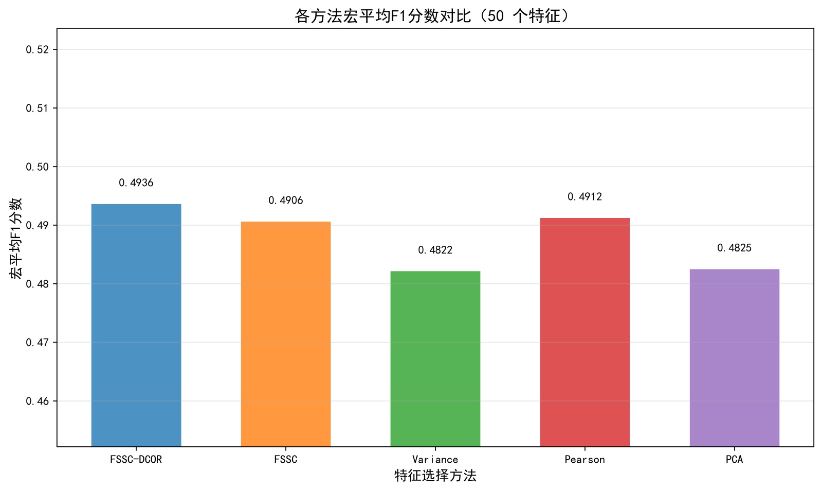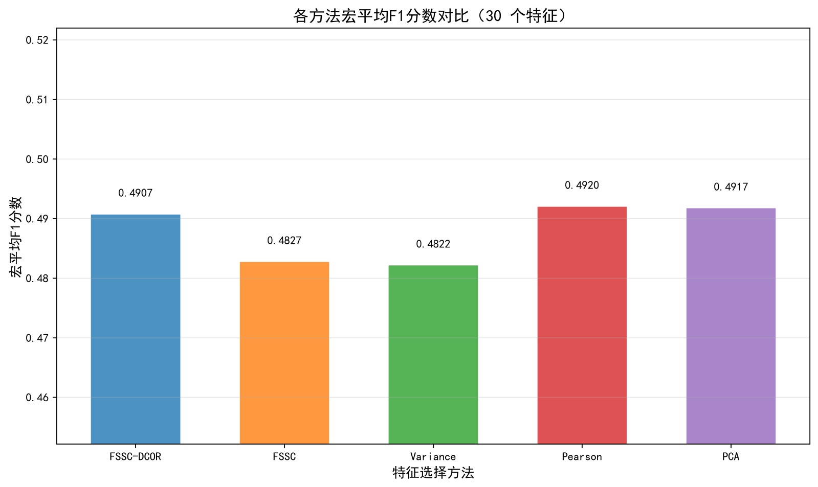 图6. 固定特征数量下宏平均F1分数的柱状图表现