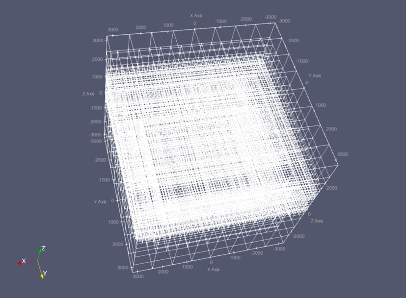 为在保证正演与反演计算精度的同时有效控制计算规模,本文采用三维八叉树(TreeMesh)网格剖分策略对研究区域进行离散化。首先构建基础网格,单元初始尺寸设定为x,y,z = 100,100,100 m,沿x、y、z三个方向分别划分为[64, 64, 64]个基元单元,共57,268个六面体单元,并以模型中心为原点(x0 = “𝐶𝐶𝐶”),从而获得覆盖整个研究域的均匀基础网格(如图2)。利用refine_tree_xyz()算法对全域实施一次全局细化,以形成具备多层次分辨率的初始网格体系,为后续局部加密提供基础。在基础网格的框架上,为兼顾近源异常体与远场关键层位的分辨需求,进一步采用区域约束的局部加密策略。其中,首先在[−1800, 1800] × [−1800, 1800] ×[−1000, −200] m的空间范围内执行一次局部细化,以提升模型中心及潜在异常体邻近区域的网格分辨率,从而增强电磁响应的刻画能力;然后,在[−3200, 3200] × [−3200, 3200] × [0, 50] m的范围内,对位于海底及其邻近区域的网格实施进一步加密。同时,x方向往外扩充2400 m (两端各1200 m),y方向往外扩充2400 m (两端各1200 m),z方向往外扩充4200 m (上端2200 m,下端2000 m)。
