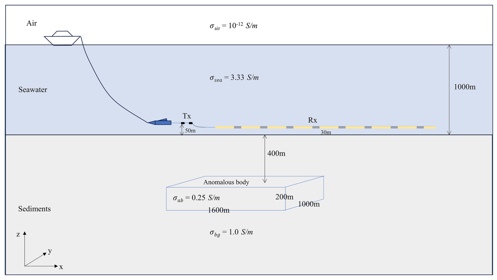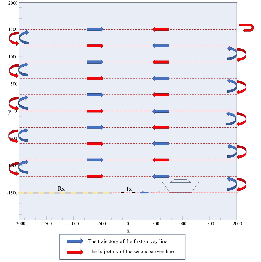 MCSEM一、二维正反演理论已经很成熟了,并且在实际生产中得到了广泛的应用。一、二维方法虽能简化计算、快速获取地层垂向或剖面电性特征,但难以准确刻画实际地质体(如倾斜油气藏、不规则矿体、非均质地层界面)的三维空间形态与电性参数分布,而这正是实际生产所追求的。MCSEM的三维正演理论研究已经走向成熟。当然,MCSEM的三维反演研究也涌现了很多,如Newman等基于非线性共轭梯度实现了横向各向异性的三维MCSEM反演[19];A.V. Grayver等使用了高斯牛顿法实现了三维MCSEM反演算法[20];Zach等实现了有限内存的BFGS (L-BFGS)的三维MCSEM反演算法[21]。然而,目前大多数的三维MCSEM反演研究都是基于“拖曳发射源 + 海底布设接收器”这种观测方式。因高效率、低成本而研发的深拖式海洋电磁装备在三维MCSEM反演研究还是比较少。Michael S. Zhdanov等采用重加权正则化共轭梯度(Reweighted Regularized Conjugate Gradient, RRCG)算法,对北海北部Troll油田的拖曳电磁数据开展了三维反演研究[22] [23];Jenny-Ann Malmberg等利用高斯牛顿法实现了拖曳电磁数据的三维反演[24];Joel Skogman等同样基于高斯牛顿法,对Barents海的拖曳电磁数据进行了三维反演分析[25];此外,Johan Mattsson等也开展了基于高斯牛顿算法的拖曳电磁数据三维反演工作[26]。