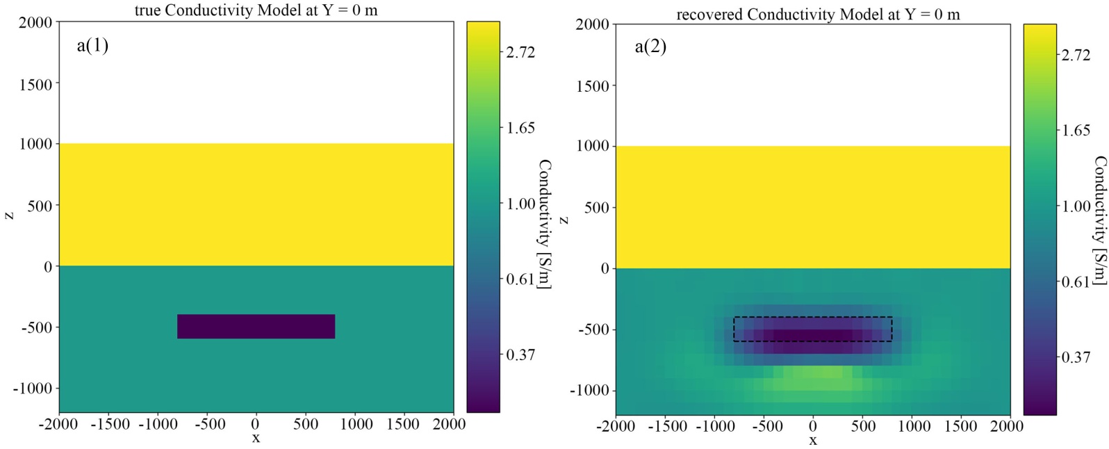 图中对比了真实模型与添加5%高斯噪声后的反演结果在Y = 0 m的垂直剖面以及Z = −300 m和Z = −700 m水平切片上的电性分布特征。整体而言,反演结果能够较好地恢复低电导率异常体的空间位置,表明反演方法在异常体空间位置重构方面具有一定有效性。在异常体电导率和边界刻画方面,反演结果仍与真实模型存在差异。在垂直剖面(Y = 0 m)上,反演能够识别异常体的埋深及横向分布,但较深的异常体电导率恢复明显减弱,边界呈现平滑扩散特征,并在异常体下方局部区域产生高电导率伪异常,反映出垂向分辨率随深度增加而降低。异常体区域电阻率值的平均相对误差为56.2% (较浅异常体区域电阻率值的平均相对误差为50.0%,较深异常体区域电阻率值的平均相对误差为62.4%),定量评价进一步说明反演在深部异常体幅值恢复上存在更大偏差。综合分析认为,该反演结果在异常体定位方面具有一定可靠性,但对深部异常体电性幅值及精细结构的分辨能力仍然不足,这体现了三维海洋电磁反演在有限观测条件下的固有分辨率限制。