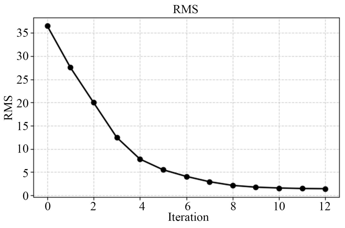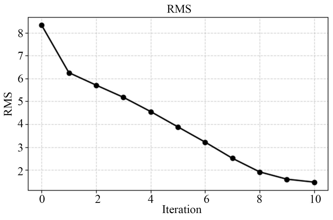 图5清晰反映了正演模型与添加5%高斯噪声后数据反演结果的对比。在水平方向(x, y)及垂直方向(z)上,反演结果较好地恢复了异常体的位置及其主要电性分布,表明该方法具备较好的三维空间分辨能力。从反演收敛过程来看(图6),均方根误差(RMS)在迭代初期快速下降,随后趋于稳定,最终收敛至约1.4,接近理想拟合水平1.0。该过程表明反演算法具有良好的收敛性。进一步对异常体区域进行定量评价,反演电阻率值的平均相对误差为39.8%,表明在海水高导电性及有限观测几何条件约束下,反演结果能够有效刻画异常体的空间位置,但在电阻率幅值恢复方面仍存在一定偏差。