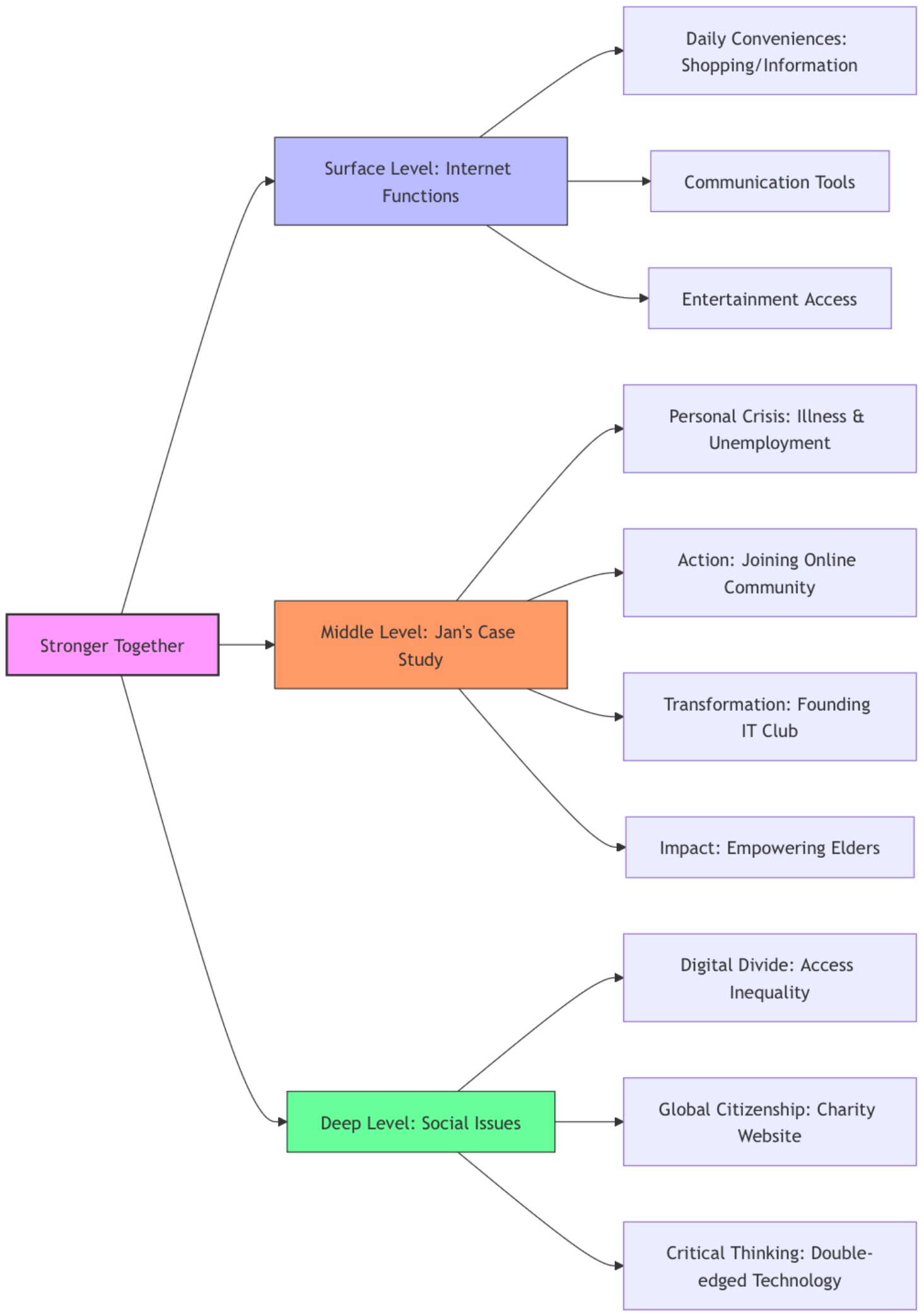 ② 文化意识:文本通过具体案例揭示了技术发展中的社会公平问题,特别是老年群体如何通过互联网重获社会连接,这为学生理解数字包容的重要性提供了真实语境。