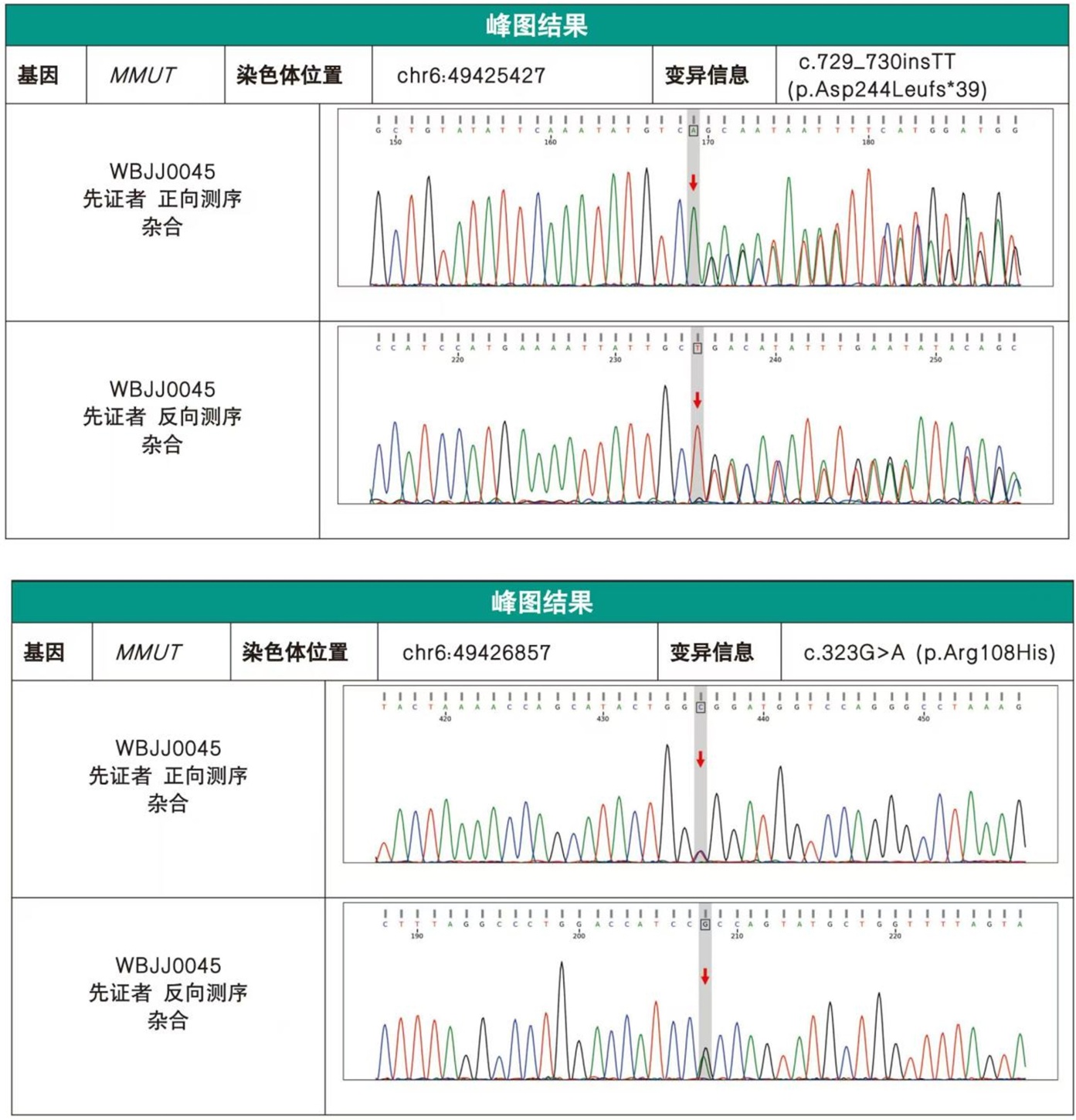 全外显子检测结果回报(图1):患儿存在两处基因变异,受检者所携c.729_730insTT (p.D244Lfs*39)变异为MMUT基因编码区的移码变异,根据Sanger验证结果显示该变异遗传自送检者母亲(杂合状态);根据现有证据,分析具有致病性,该变异被定义为致病变异;受检者所携c.323G > A (p.R108H)变异为MMUT基因编码区的错义变异,根据Sanger验证结果显示该变异遗传自送检者父亲(杂合状态);根据现有证据,分析具有致病性,该变异被定义为致病变异。