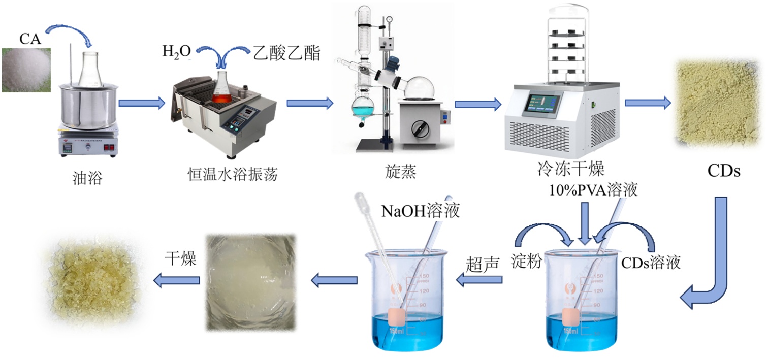 以柠檬酸为原料,称取10 g柠檬酸,将其放入500 mL锥形瓶中,在190℃下的油浴锅中进行熔化,固体由白色粉末变为橙色粘稠液体后取出,冷却后加入100 mL水在恒温水浴振荡器中混合均匀,同时少量多次加入100 mL乙酸乙酯进行萃取,静置分层后取上层澄清溶液于旋蒸瓶中,加入等量去离子水在55℃下进行减压蒸馏,在液滴停止滴落后升温继续蒸馏,直至乙酸乙酯完全去除。将获得的CDs水溶液冻干即可得到产物CDs。将制备的CDs溶于水中备用,PVA溶于水制备10%的PVA溶液,并将淀粉溶液加入PVA溶液中超声混合后加入CDs水溶液,搅拌均匀。配置50%的NaOH溶液,逐滴加入到装有混合溶液的烧杯中,搅拌至凝胶状,得到制备好的CDs/Gel,制备流程如图1所示。