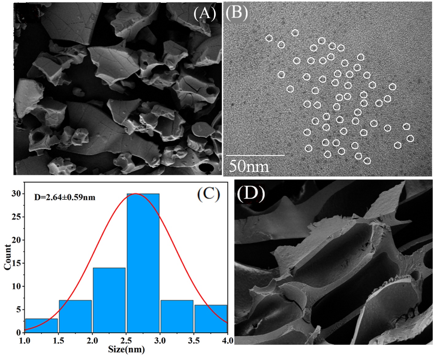 Figure 2. (A) The SEM image of CDs; (B) The TEM image of CDs; (C) The particle size distribution diagram; (D) The SEM image of CDs/Gel