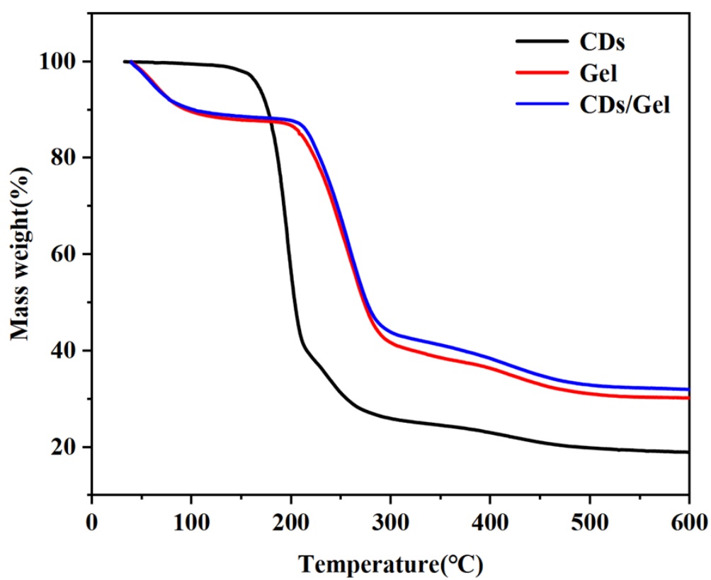 图5. CDs、Gel和CDs/Gel的TGA图