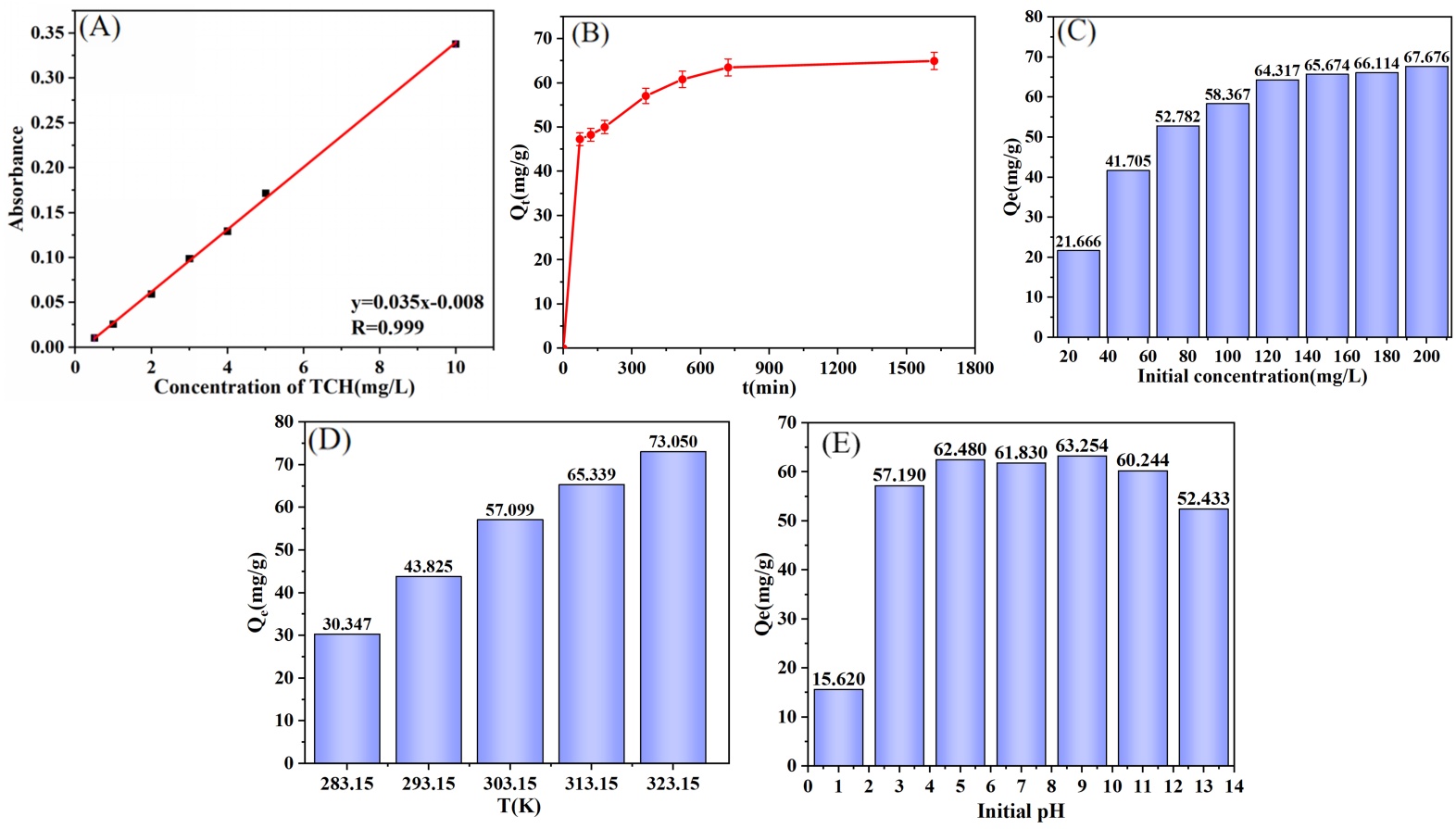 Figure 6. (A) Standard curve for TCH; Effect of (B) Adsorption time; (C) Initial concentration; (D) Temperature; (E) pH on adsorption