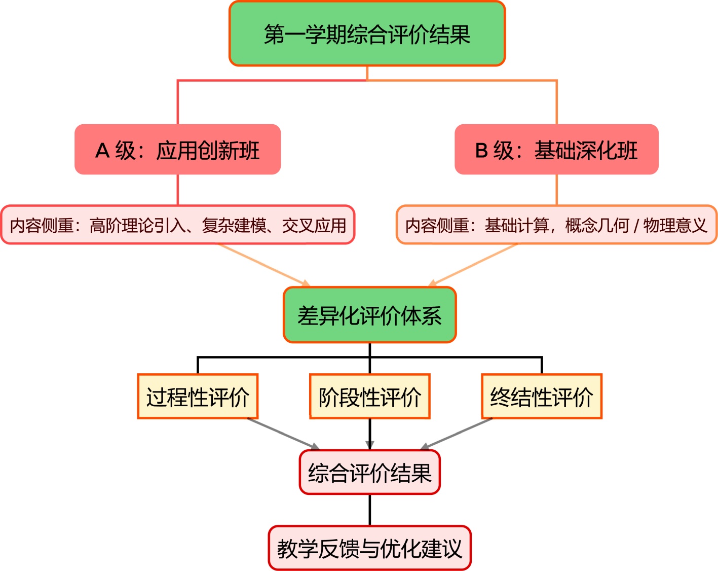 分级标准基于学前摸底测试与线上学习数据(完成度、成绩、参与度),将学生初步分为A级(应用创新班)与B级(基础深化班),并在后续进行阶段性动态调整;在教学实施的线下课堂中,教师针对不同层级的学生实施差异化教学,B级学生侧重于基础概念的巩固与计算训练,注重对概念的几何、物理意义的理解;A级学生则聚焦高阶理论、复杂建模与交叉学科应用的引入;关于评价适配方面A级考核强调创新性和建模能力,开放性应用题和项目式作业(PBL)占比高;B级考核注重基础知识点的扎实掌握,基础题占比高,强调过程完整性,如图4。