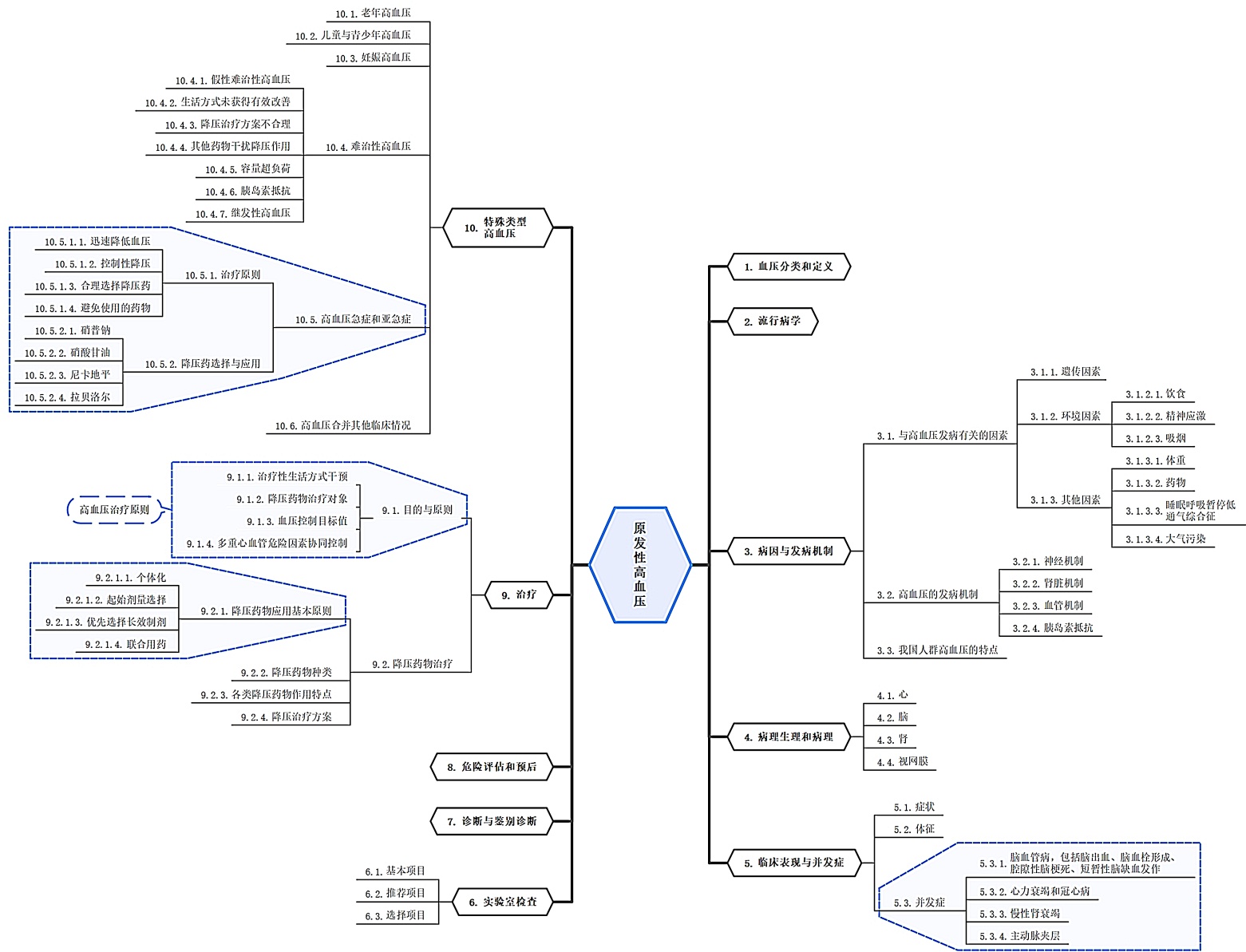 在临床专业课程教学中,由于学科知识的独特性和复杂性,引入思维导图后,学生能够通过图形化的知识结构,快速捕捉和理解疾病机理、诊断步骤和治疗方案,极大提高信息记忆与回忆的效率[8]。相较于传统的课堂教学,思维导图能显著增加学生参与课堂讨论的积极性,这不仅因其清晰的逻辑性,更在于其激发学生主动探索知识深层关系的潜力[9]。思维导图在多门专业课程中的应用,有助于学生对疾病知识体系的构建和理解。例如在讲授内科学原发性高血压时(见图2),引用思维导图教学法,有助于学生充分理解该部分的知识。与此同时,学生在课后根据自己的理解进行思维导图的绘制,让教与学形成闭环,一方面教师可以了解学生的学习效果,另一方面学生在绘制过程中可以增加对知识的掌握与知识的梳理。