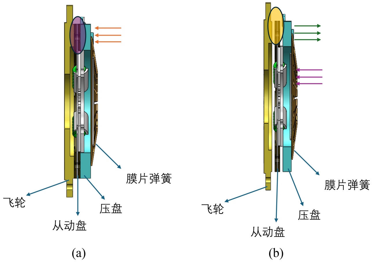 图4. 膜片弹簧离合器工作过程图。(a) 离合器接合原理图;(b) 离合器分离原理图