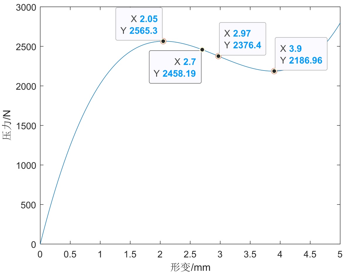 式中,E:弹性模量;μ:泊松比;h:弹簧钢板厚度;H:膜片弹簧的内截锥高;R、r分别为膜片弹簧大端、小端半径;R1、r1分别为压盘加载点和支承环加载点半径。最终得到膜片弹簧压力–形变曲线,如图6所示。