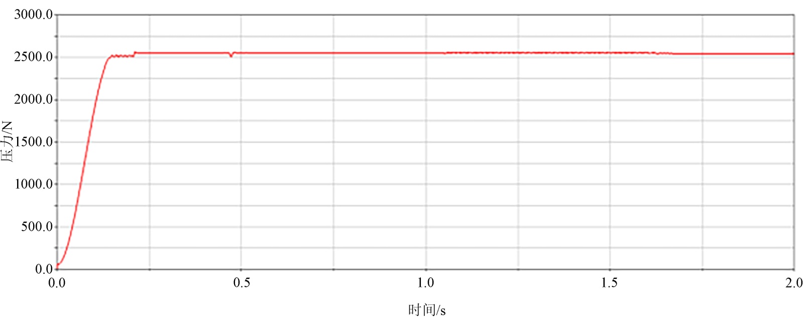 在0~0.15 s时,压力从0 N急剧上升至约2500 N,在这一阶段工作过程中,膜片弹簧受力逐渐减小,压盘施加在离合器摩擦片表面的压紧力随之增大。快速压紧阶段所用时间非常短,体现了膜片弹簧离合器机构的高效性。